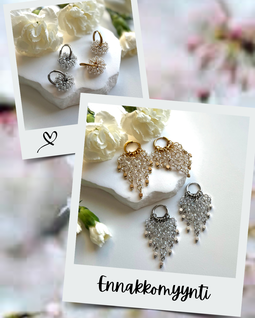 Lähes kaikki korumallit ovat muokattavissa. Onko suosikkikorviksissasi kullatut metalliosat, mutta haluaisit hopeanväriset? Myös kiinnityksen voi vaihtaa maksutta.