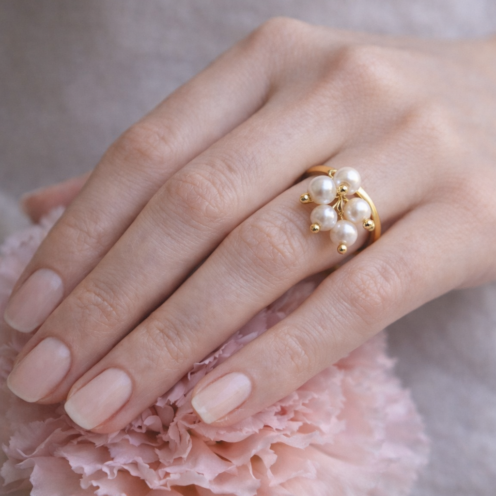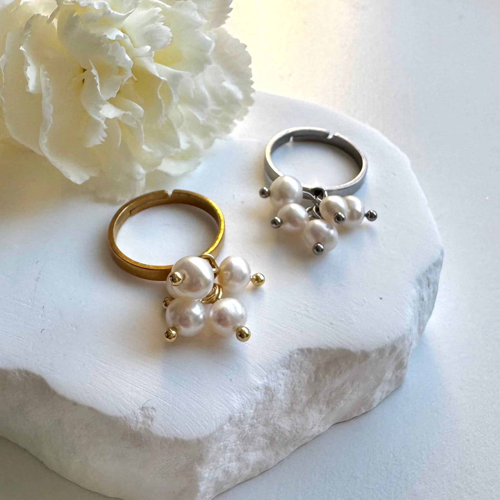 Zen Designin ensimmäiset sormukset on nyt täälllä! Kullanväriset sormukset on pinnoitettu kestävällä 18K PVD-kultauksella. Sormuksesssa riippuu 5 pientä makeanvedenhelmeä.