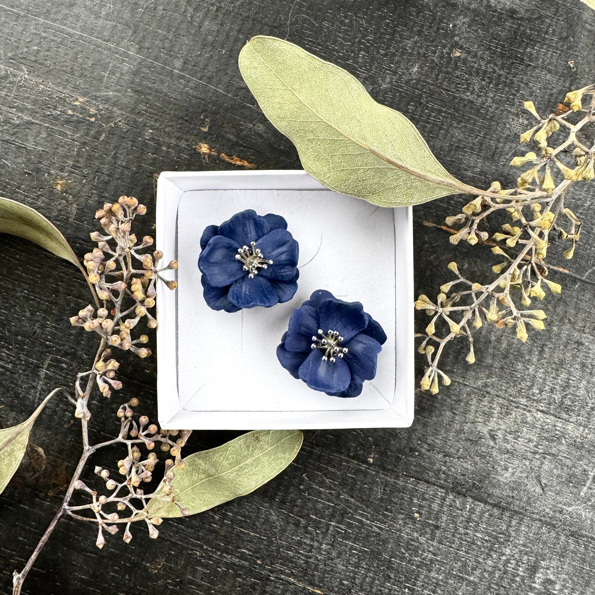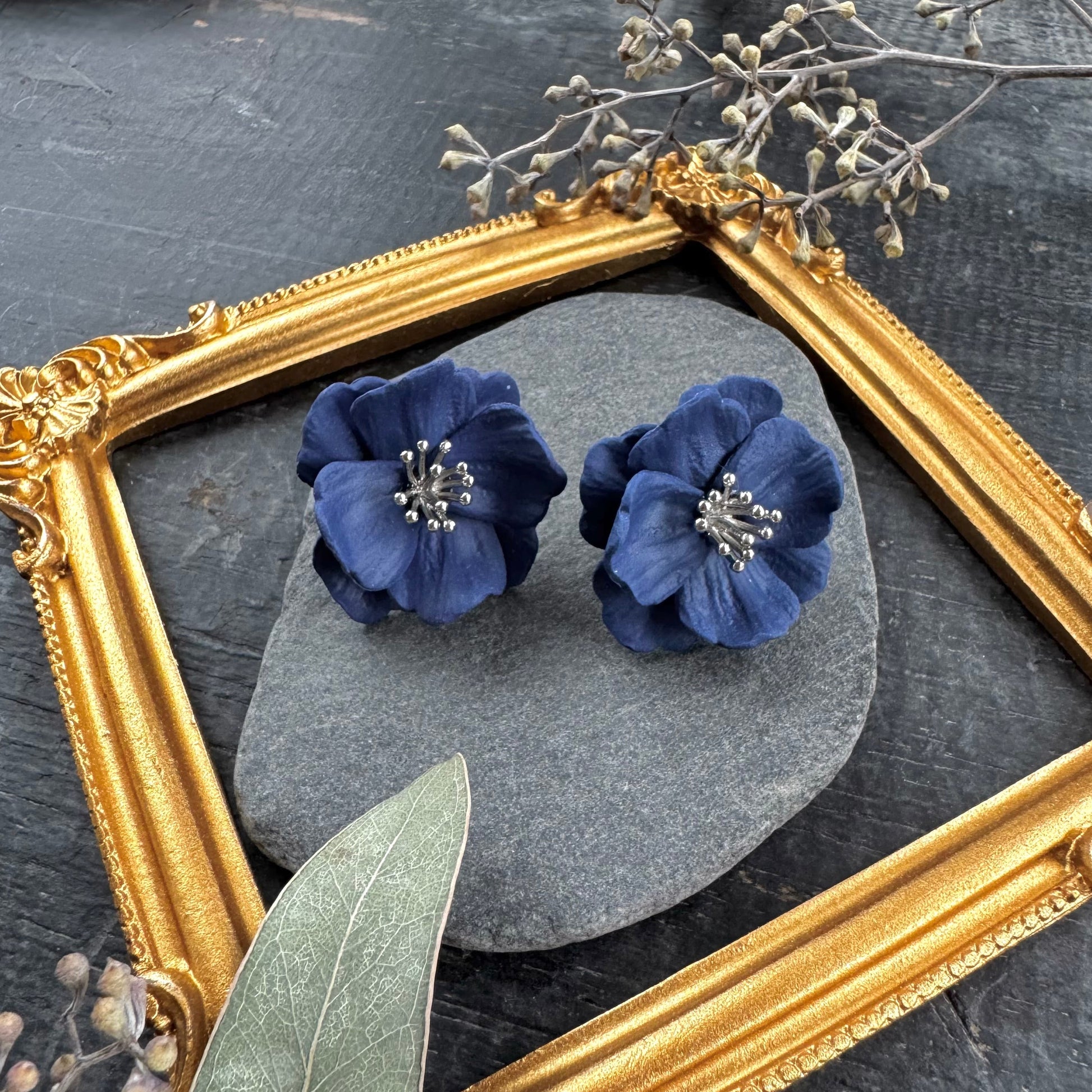 Tummansiniset kukkanappikorvakorut! Koostaan huolimatta korvakorut ovat todella kevyet. Mukana tulee myös normaalia isommat taustat, jotka pitää kukat tiiviisti korvanlehteä vasten.