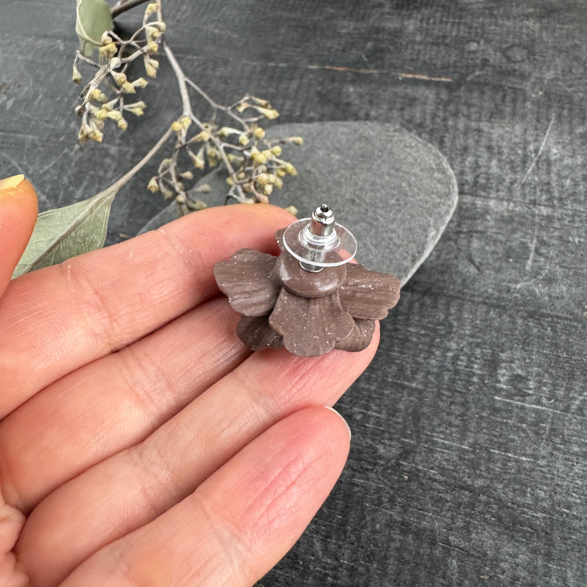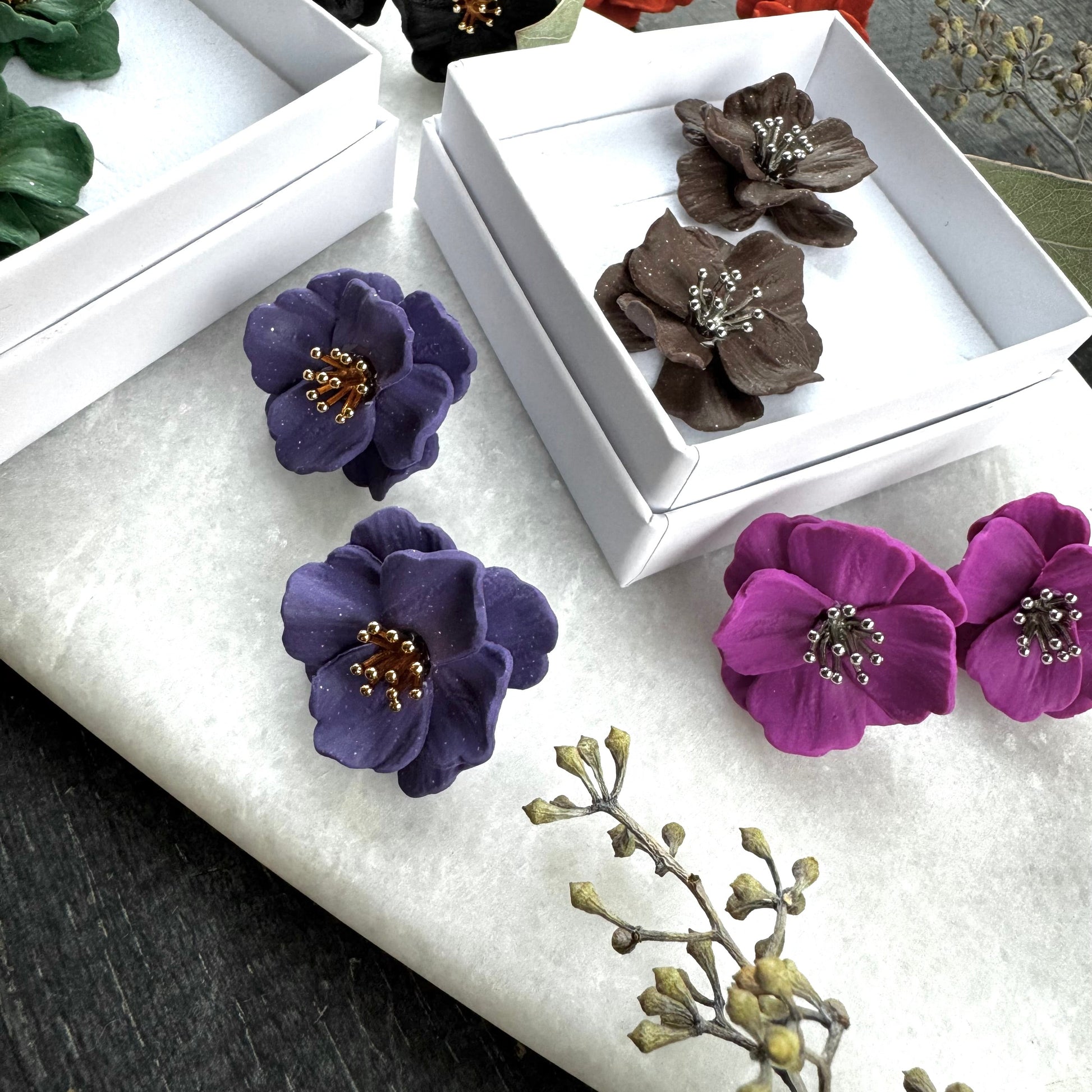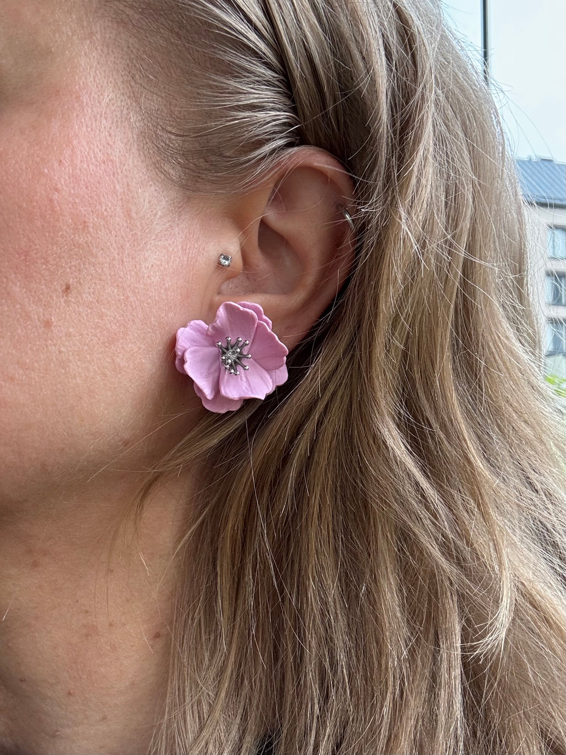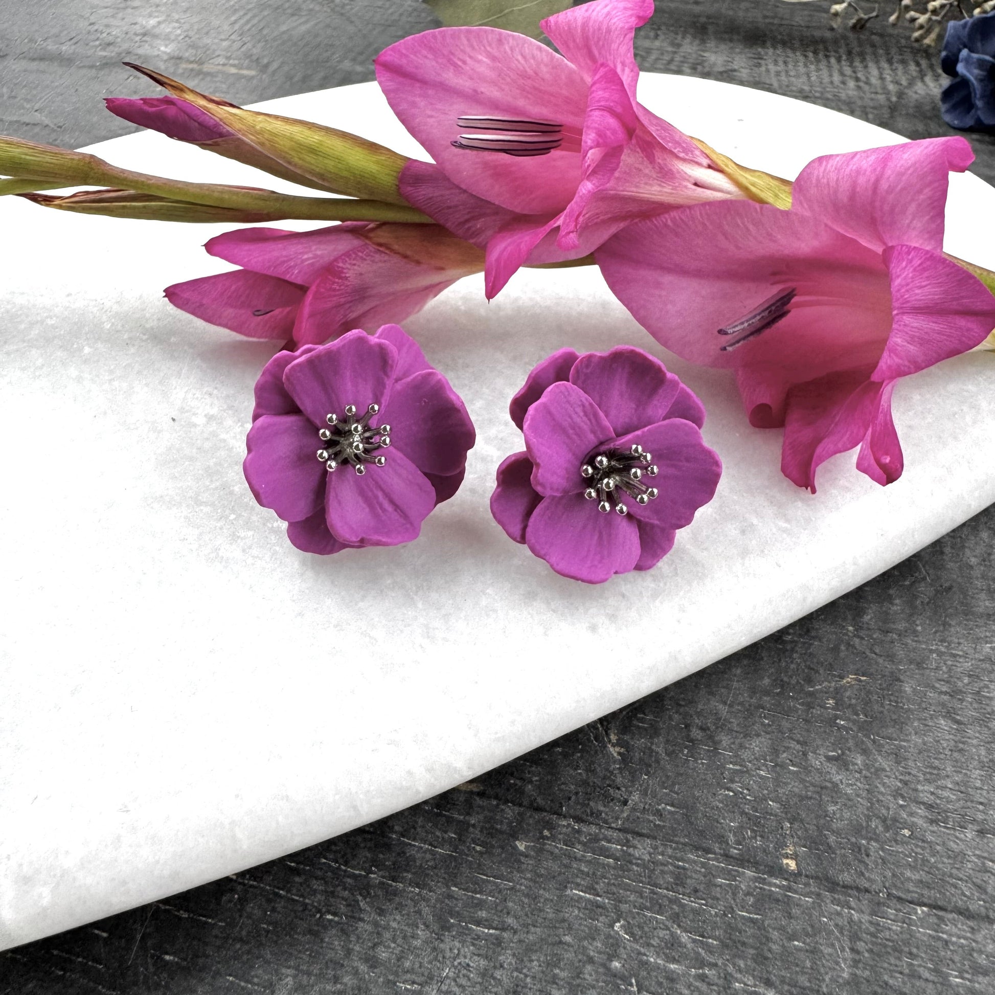 Fuksian punaiset kukkanappikorvakorut! Koostaan huolimatta korvakorut ovat todella kevyet. Mukana tulee myös normaalia isommat taustat, jotka pitää kukat tiiviisti korvanlehteä vasten.