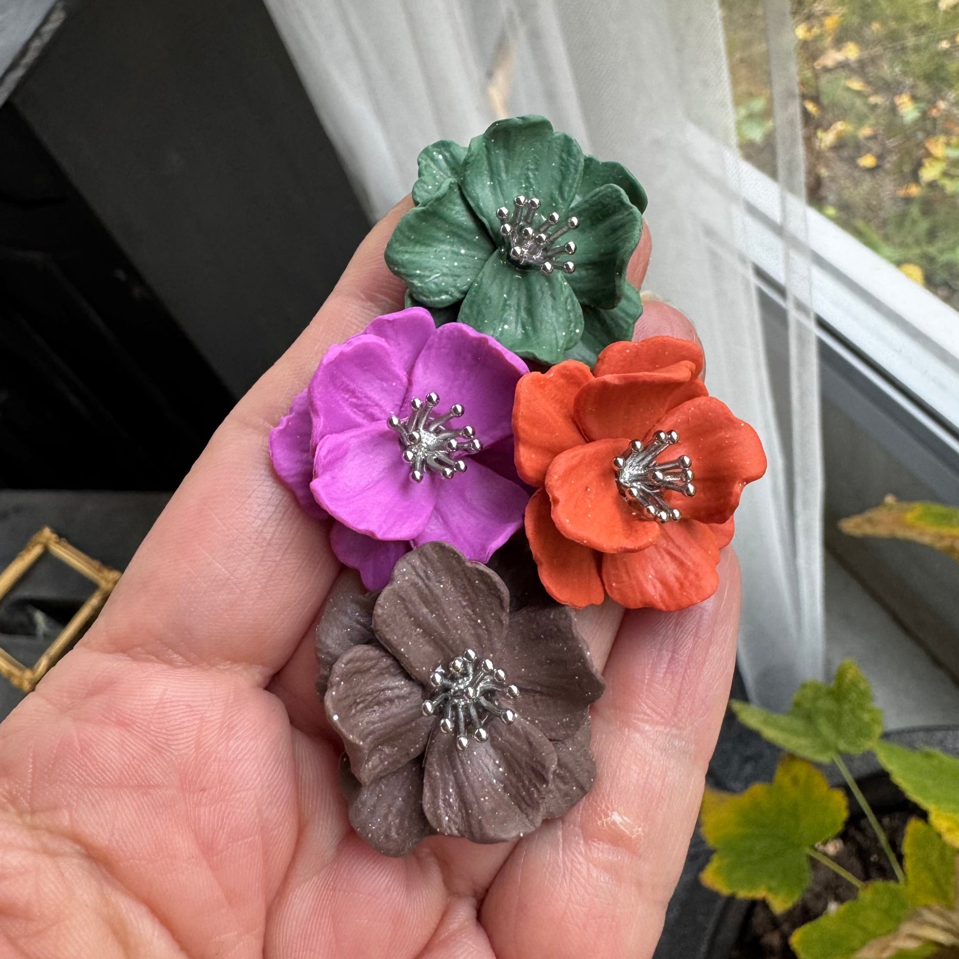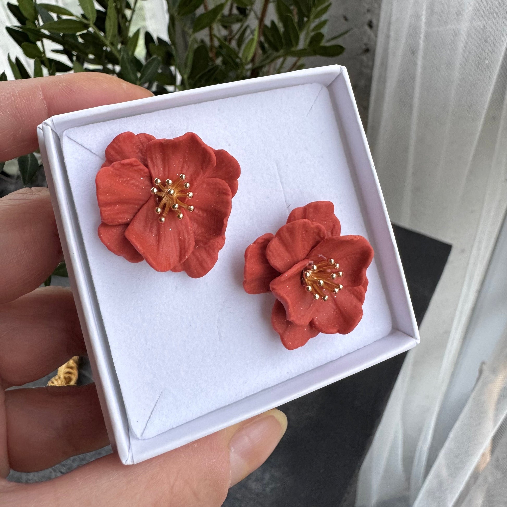 Oranssit kukkanappikorvakorut! Koostaan huolimatta korvakorut ovat todella kevyet. Mukana tulee myös normaalia isommat taustat, jotka pitää kukat tiiviisti korvanlehteä vasten.