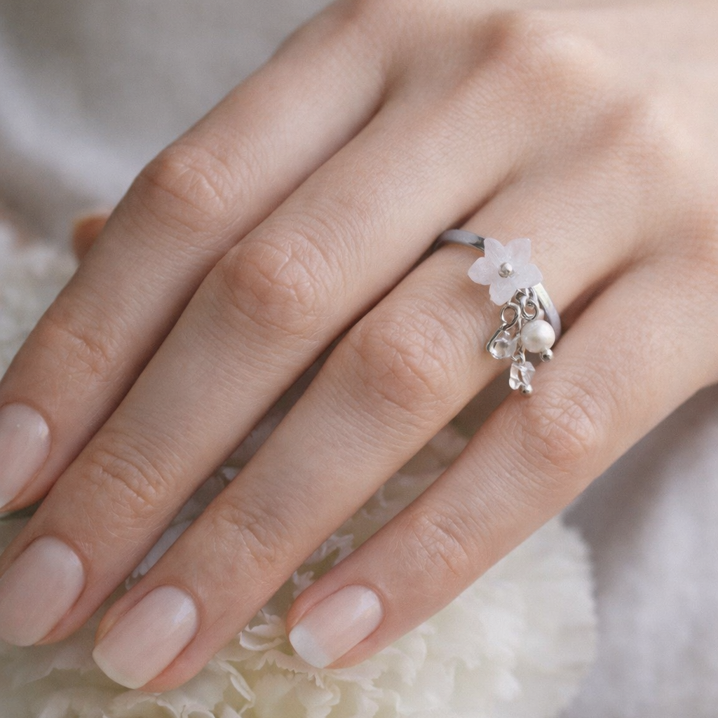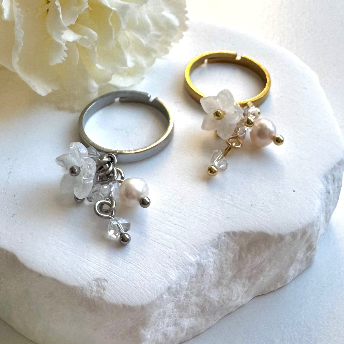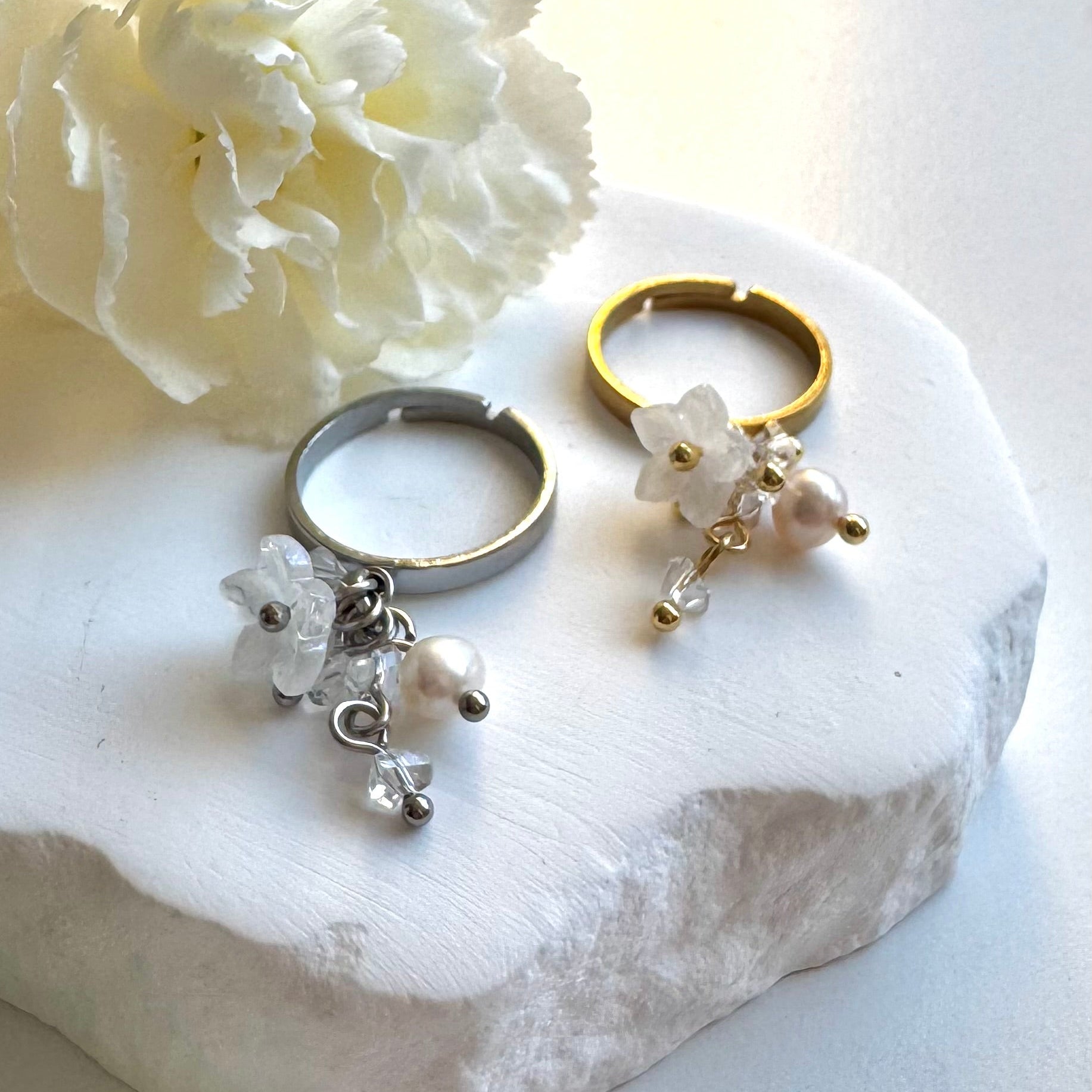 Zen Designin ensimmäiset sormukset on nyt täällä! Kullanväriset sormukset on pinnoitettu kestävällä 18K PVD-kultauksella. Sormuksessa riippuu lasinen kukka sekä muita pieniä helmiä.
