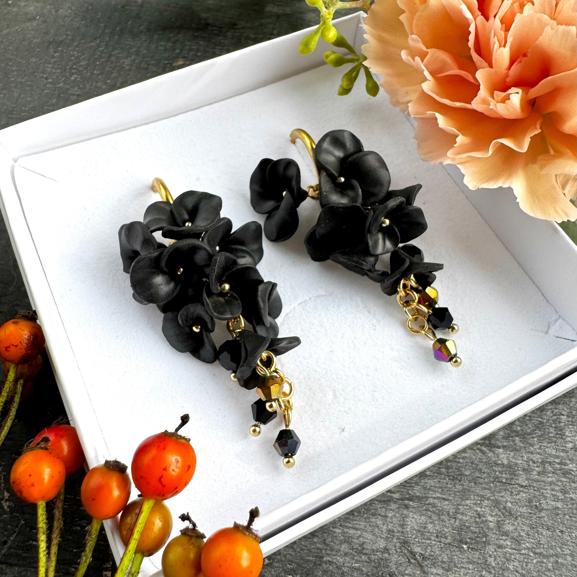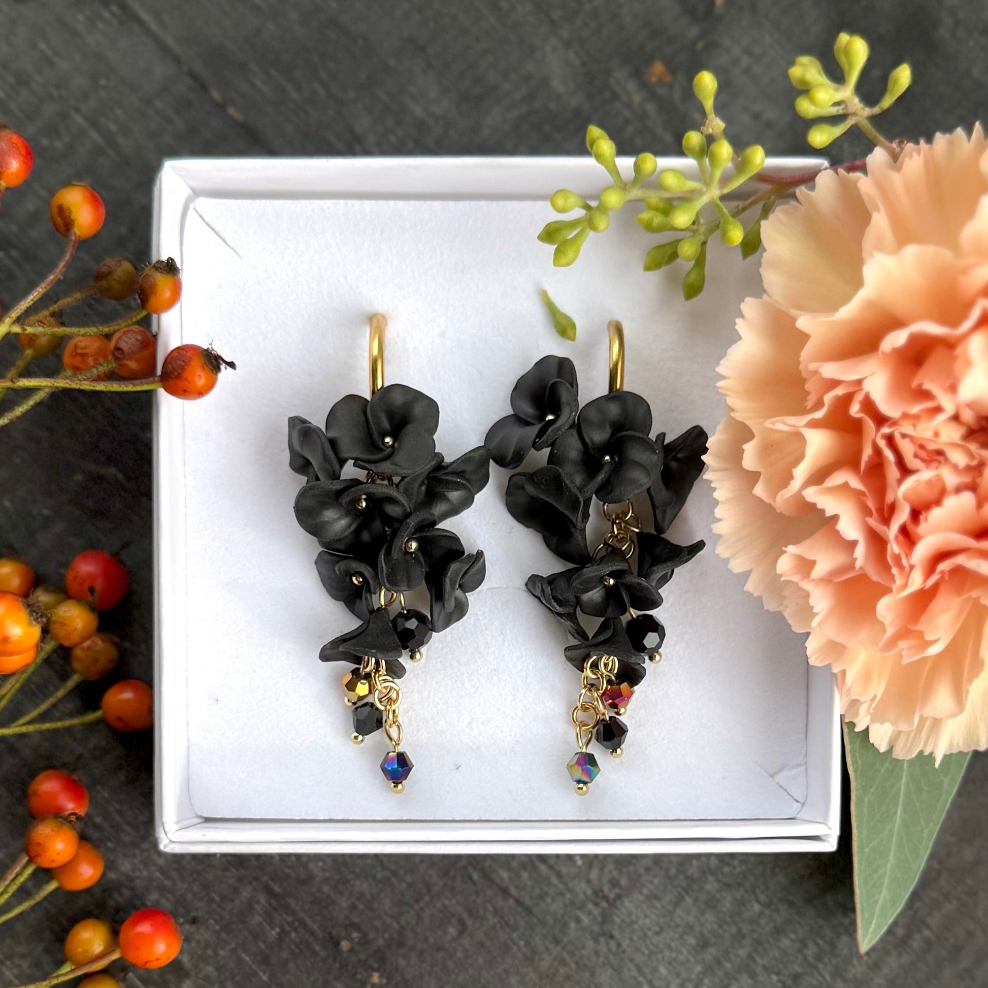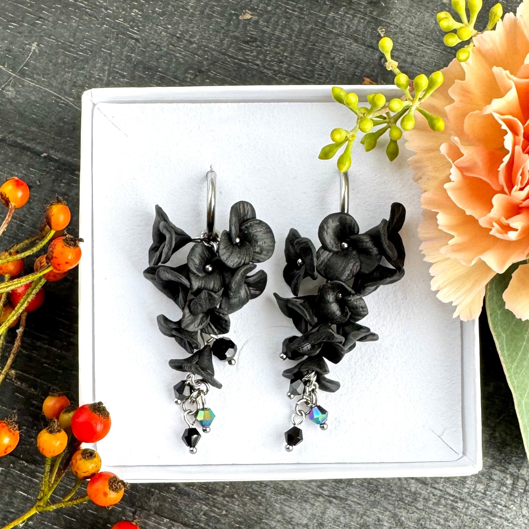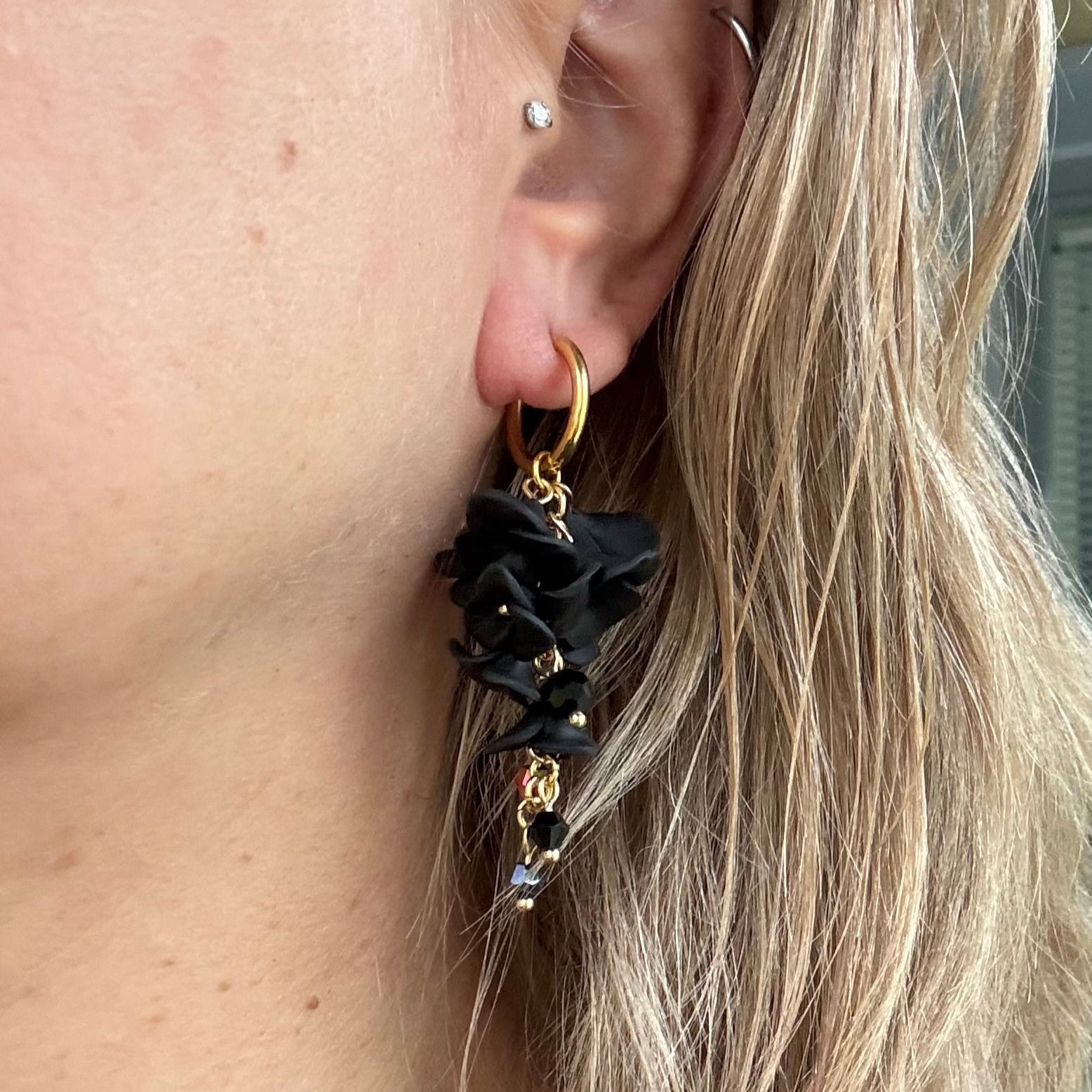 Näitä on toivottu! Uudistettu Kukkaketo nyt mustana! Tässä koruparissa on yhteensä 16 mustaa käsintehtyä kukkaa. Kukat on muotoiltu peräti 48 erillisestä terälehdestä!