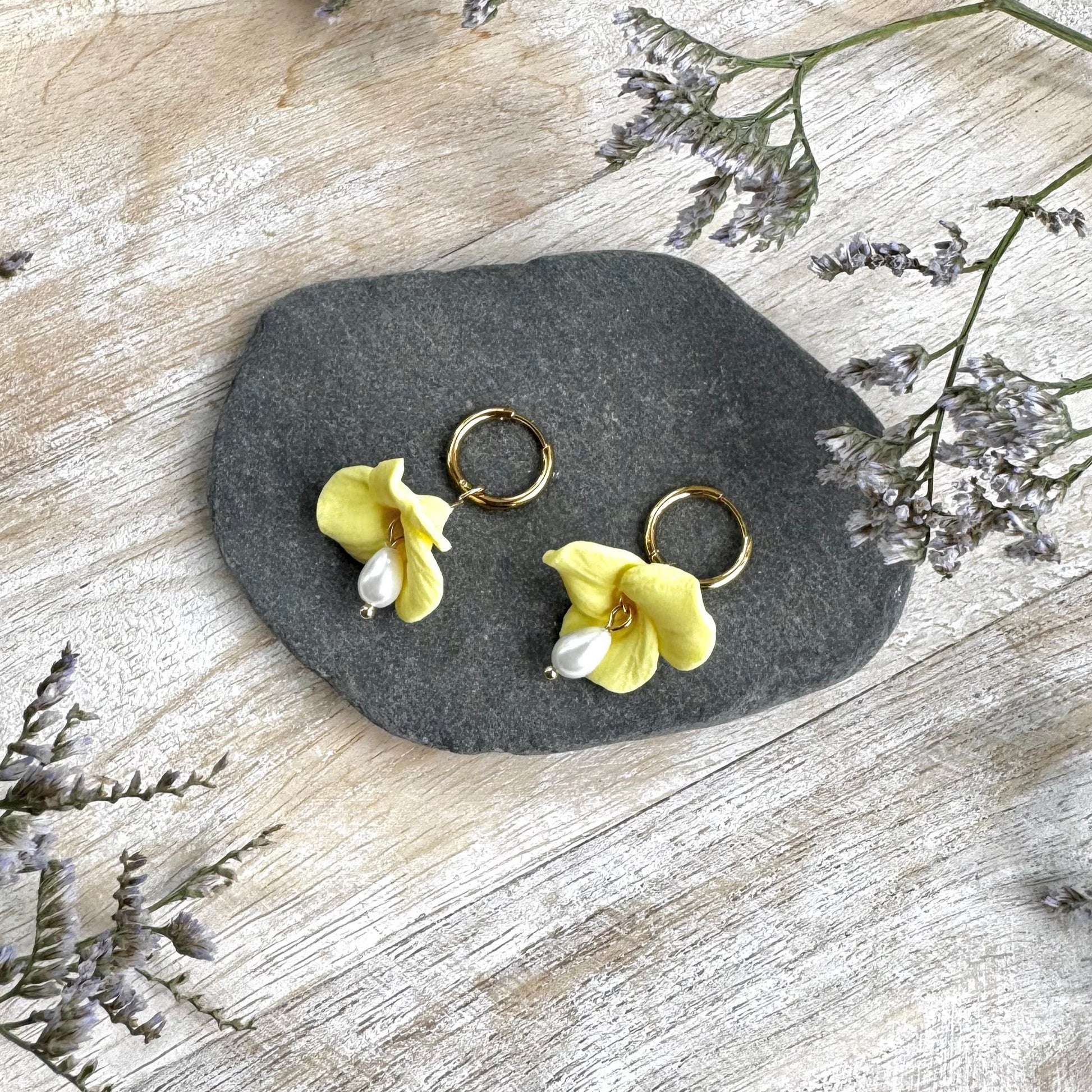 Suloiset, vaalean keltaiset kukkakorvakorut! Jokainen kukka on uniikki.