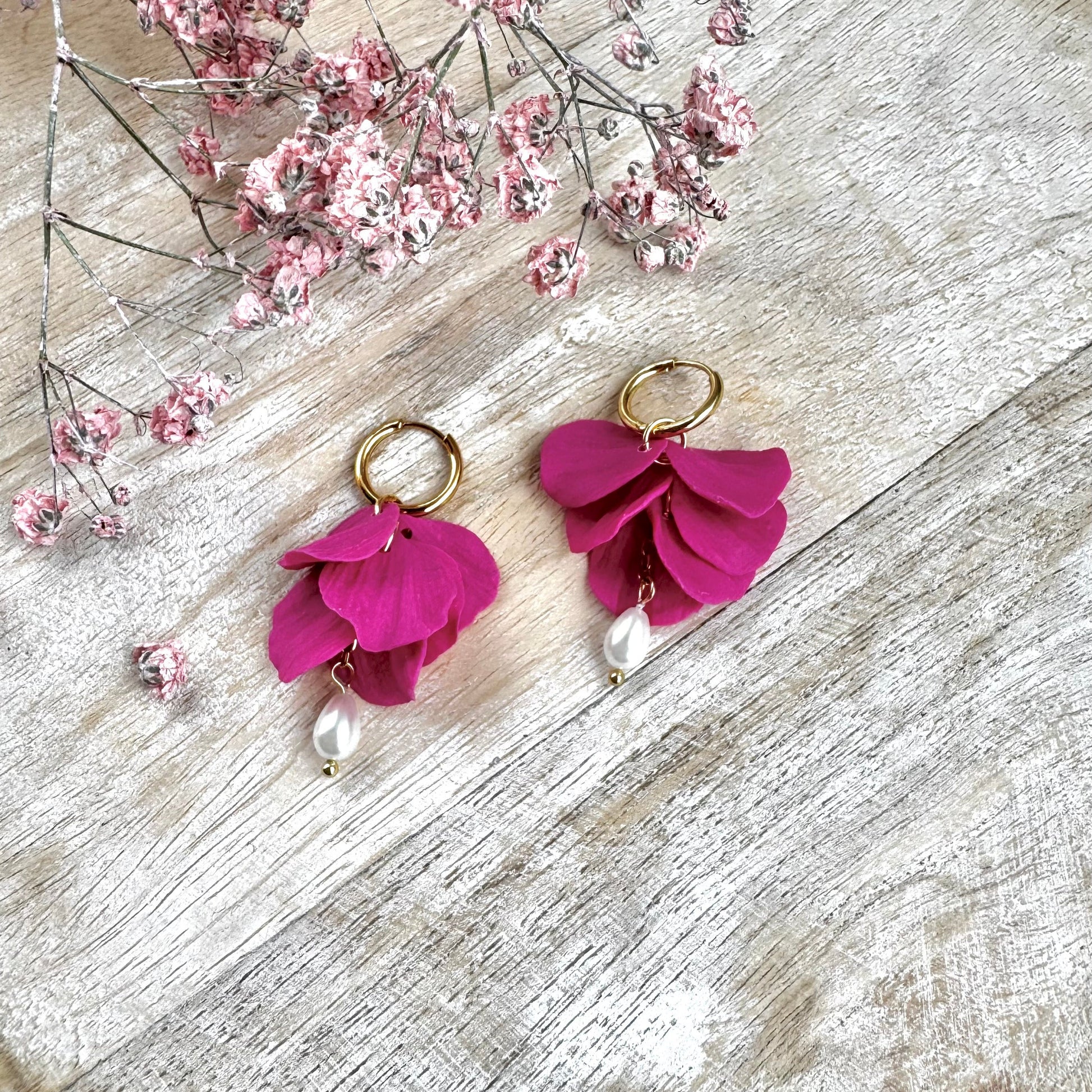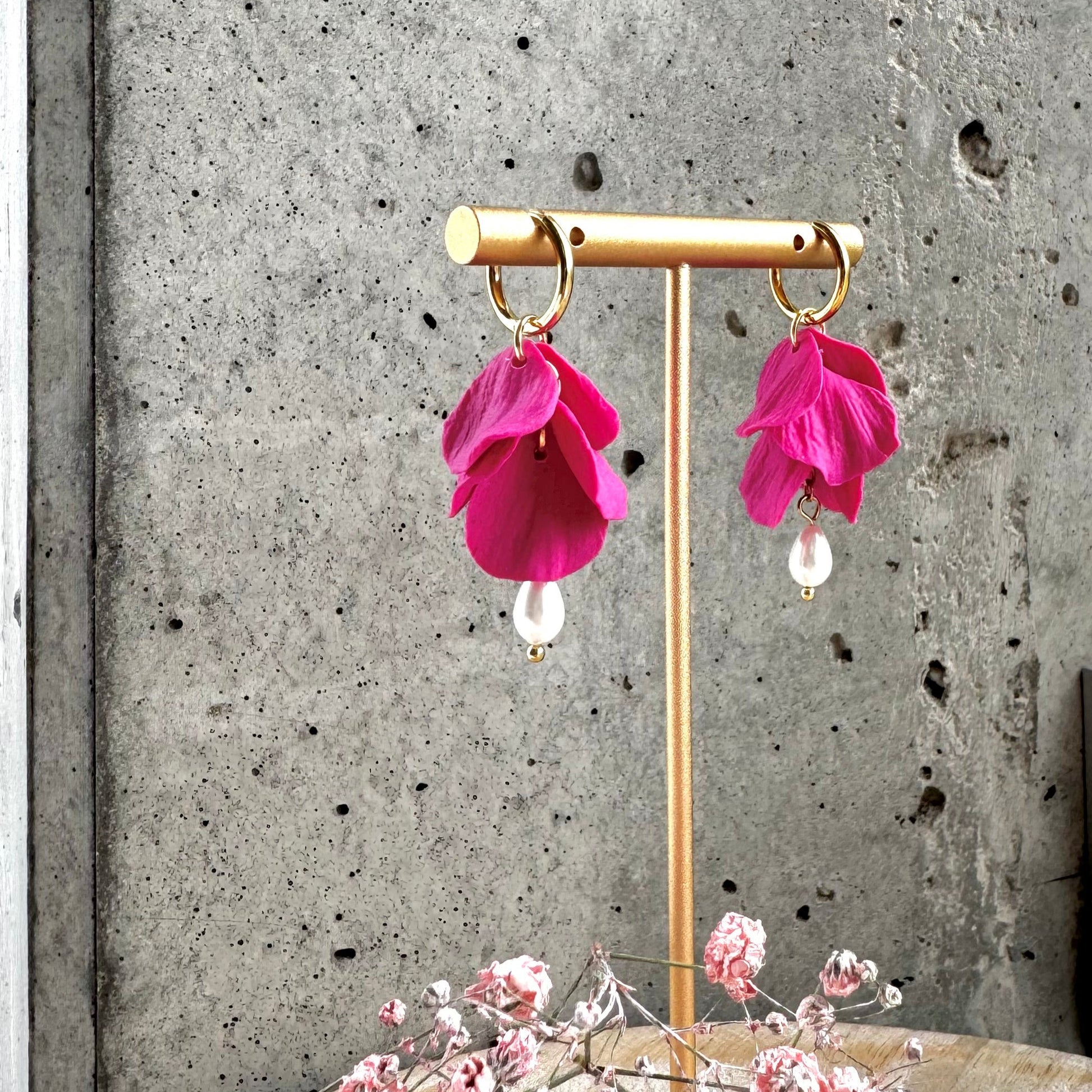 Pinkit lehtikorvakorut, joissa kiinnityksenä pieni, siro huggie-rengas.