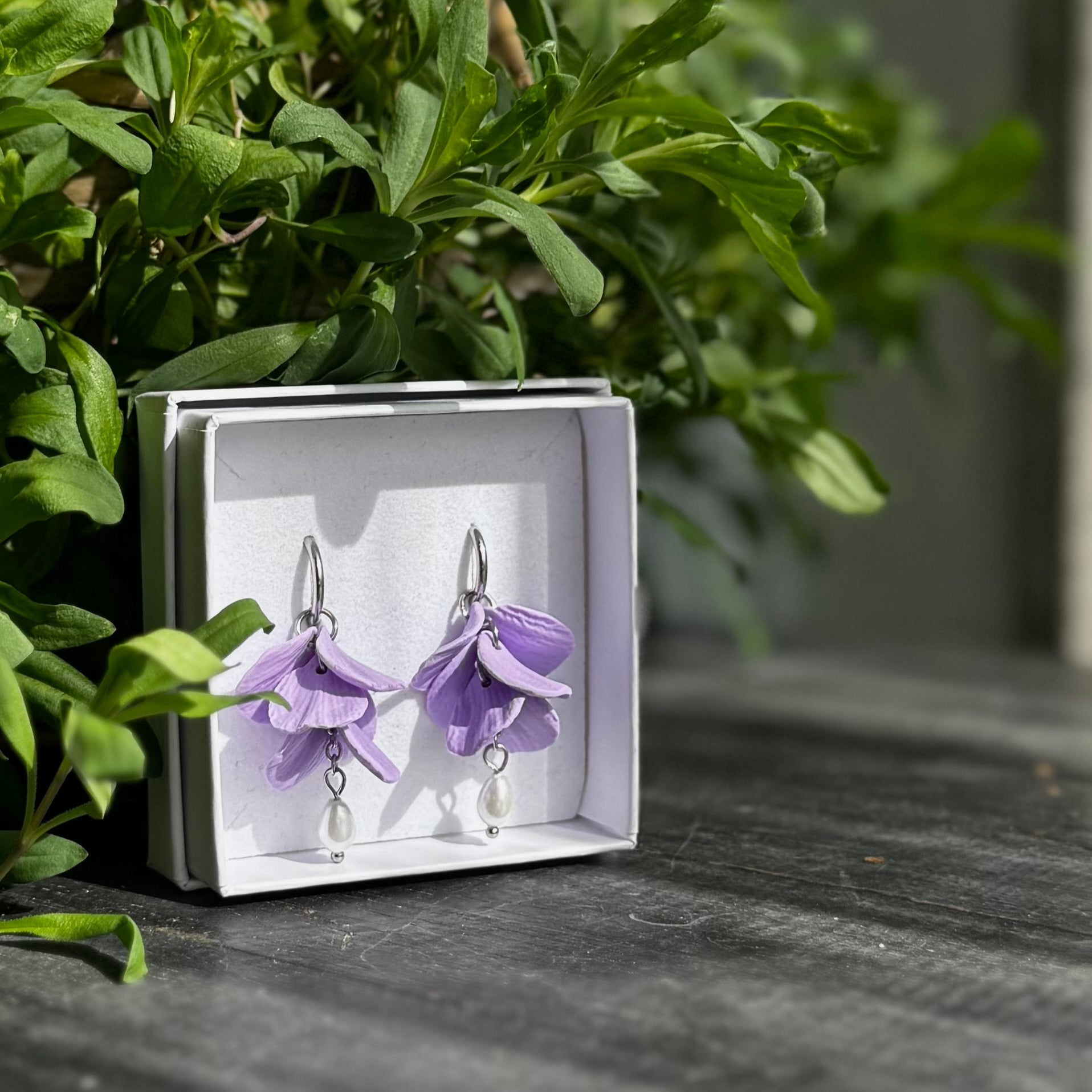 Korvakorut, joissa vaaleanlilat kukan terälehdet sekä pieni, siro huggie-rengas!