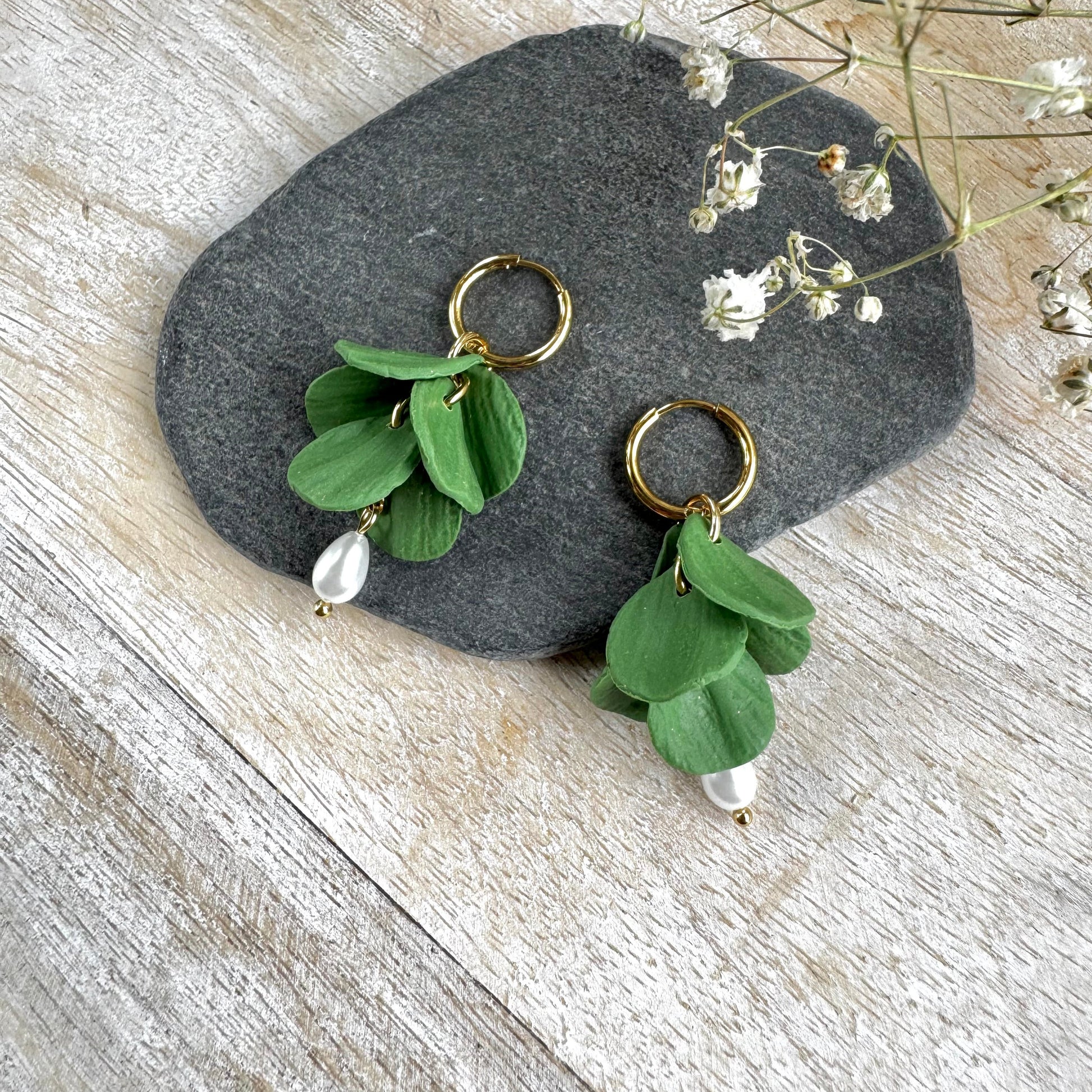 Vihreät lehtikorvakorut, joissa kiinnityksenä pieni, siro huggie-rengas.