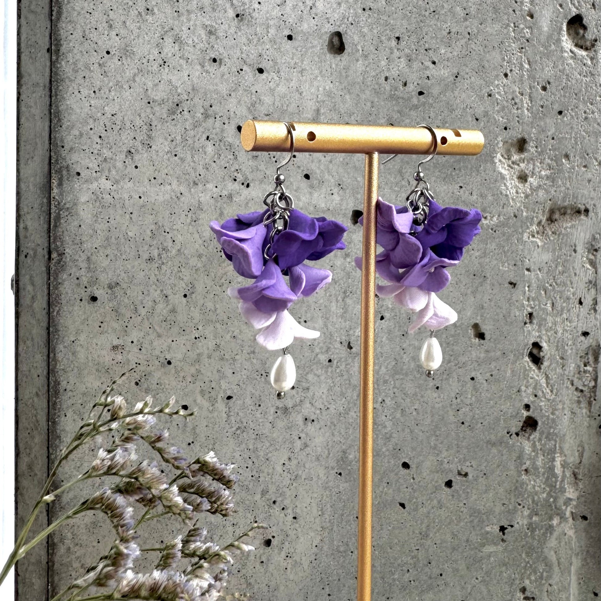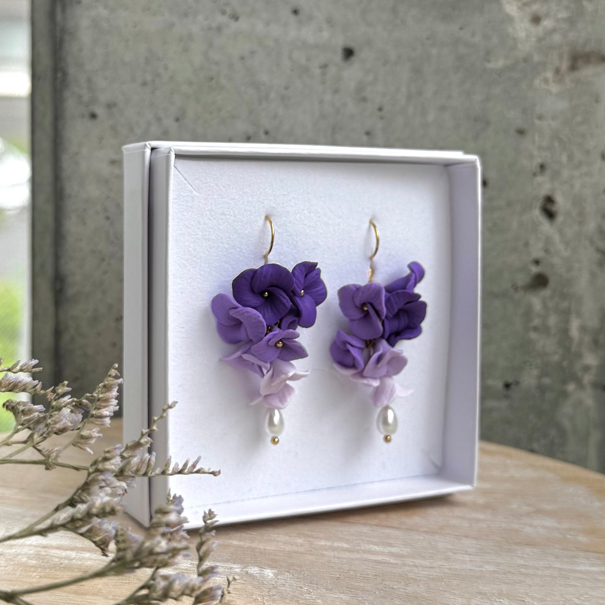 Tässä koruparissa on yhteensä 16 lilan ja violetin sävyistä käsintehtyä kukkaa.