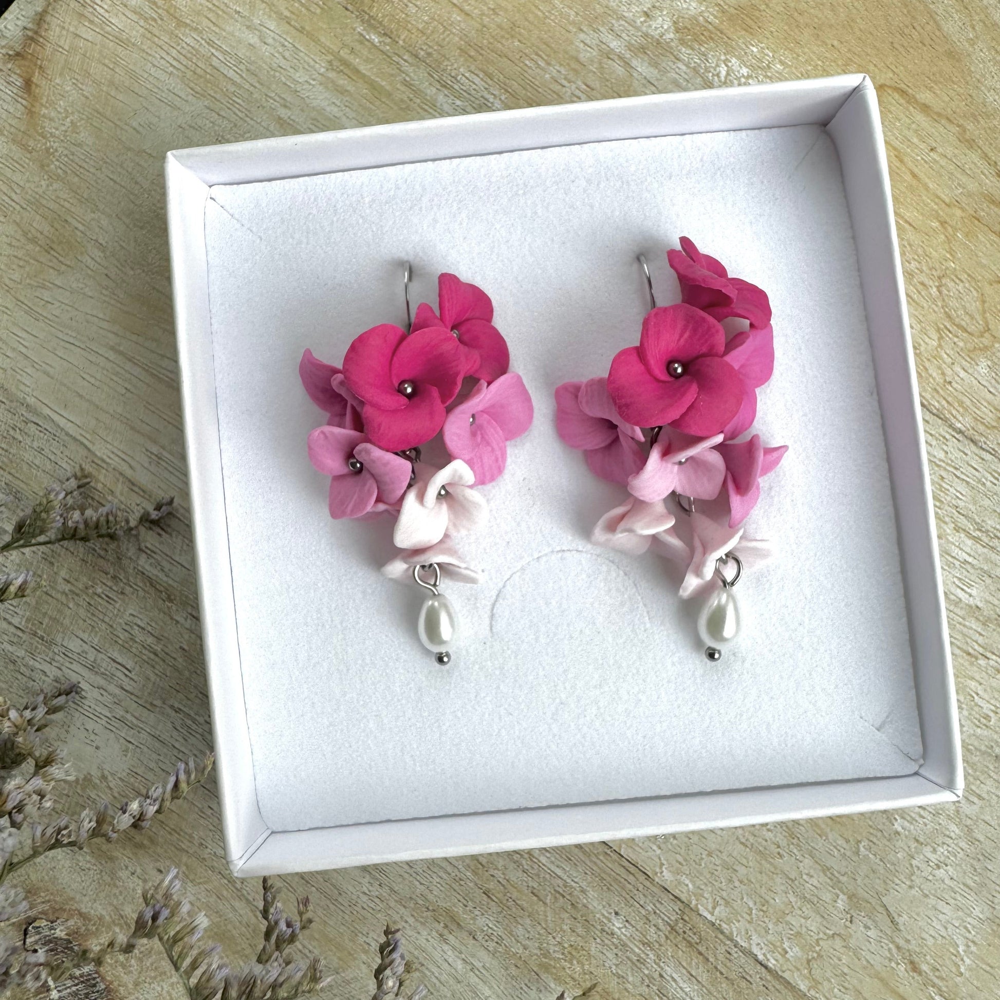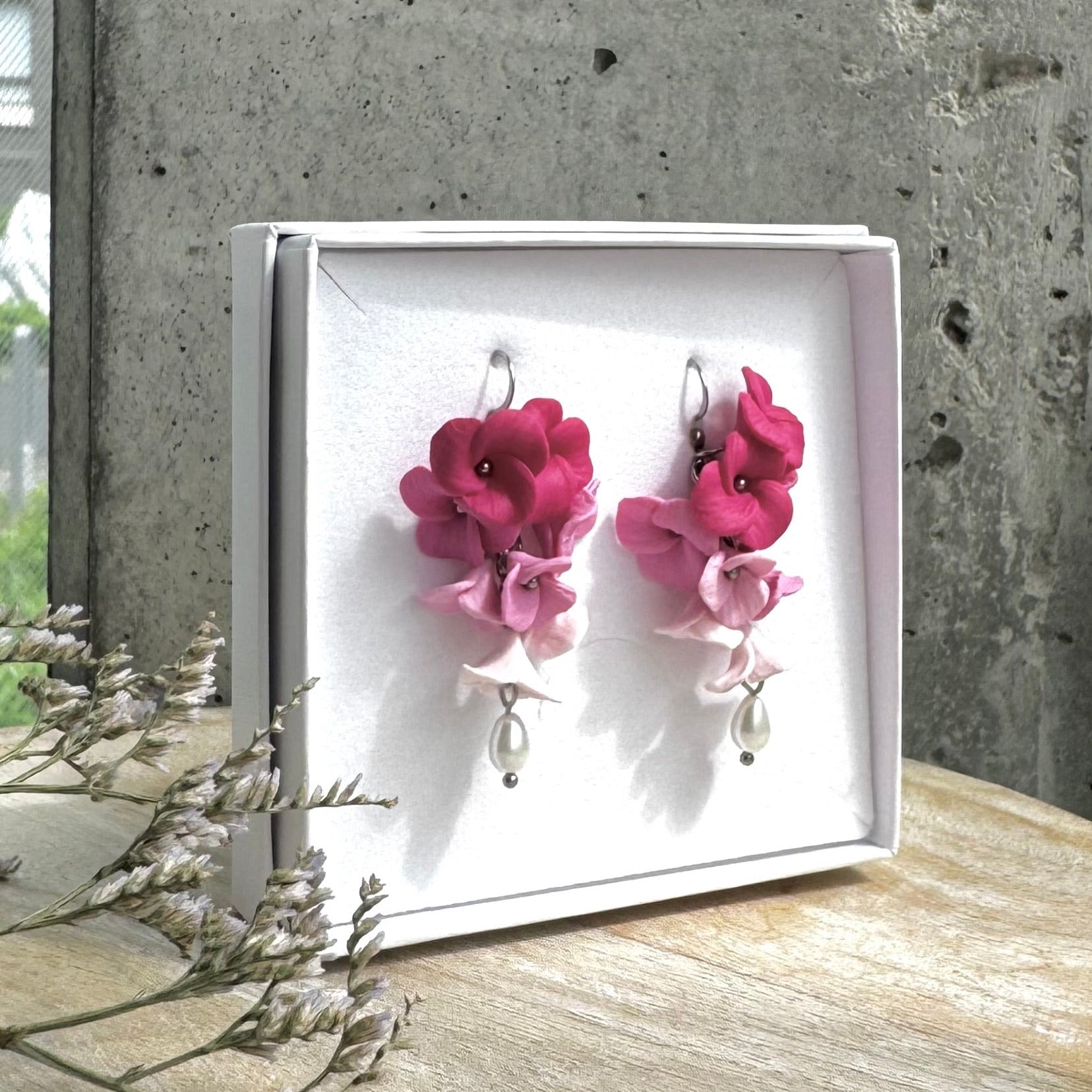 Tässä koruparissa on yhteensä 16 vaaleanpunaisen ja pinkin sävyistä käsintehtyä kukkaa.