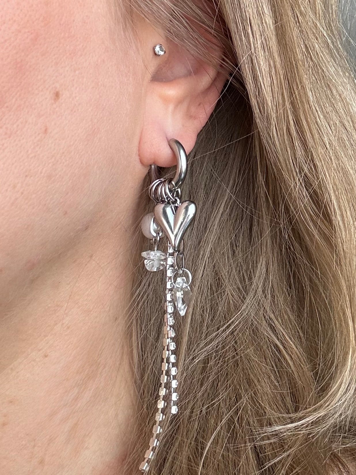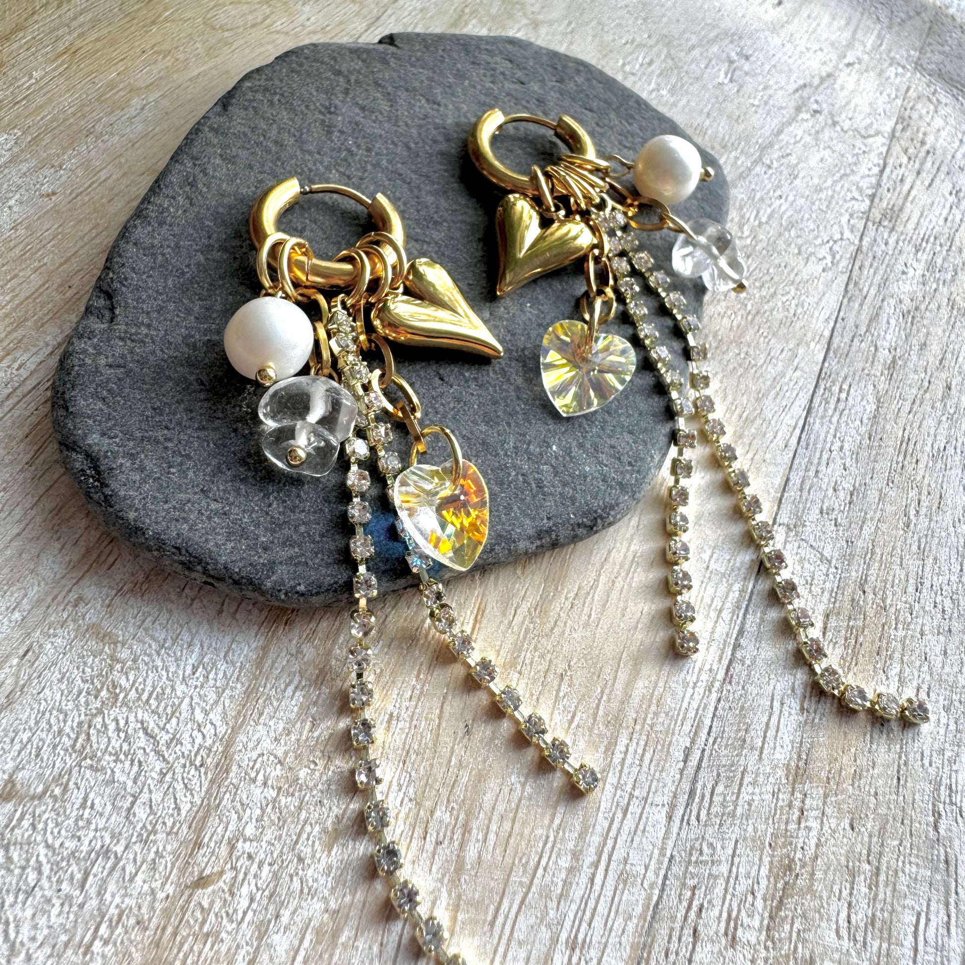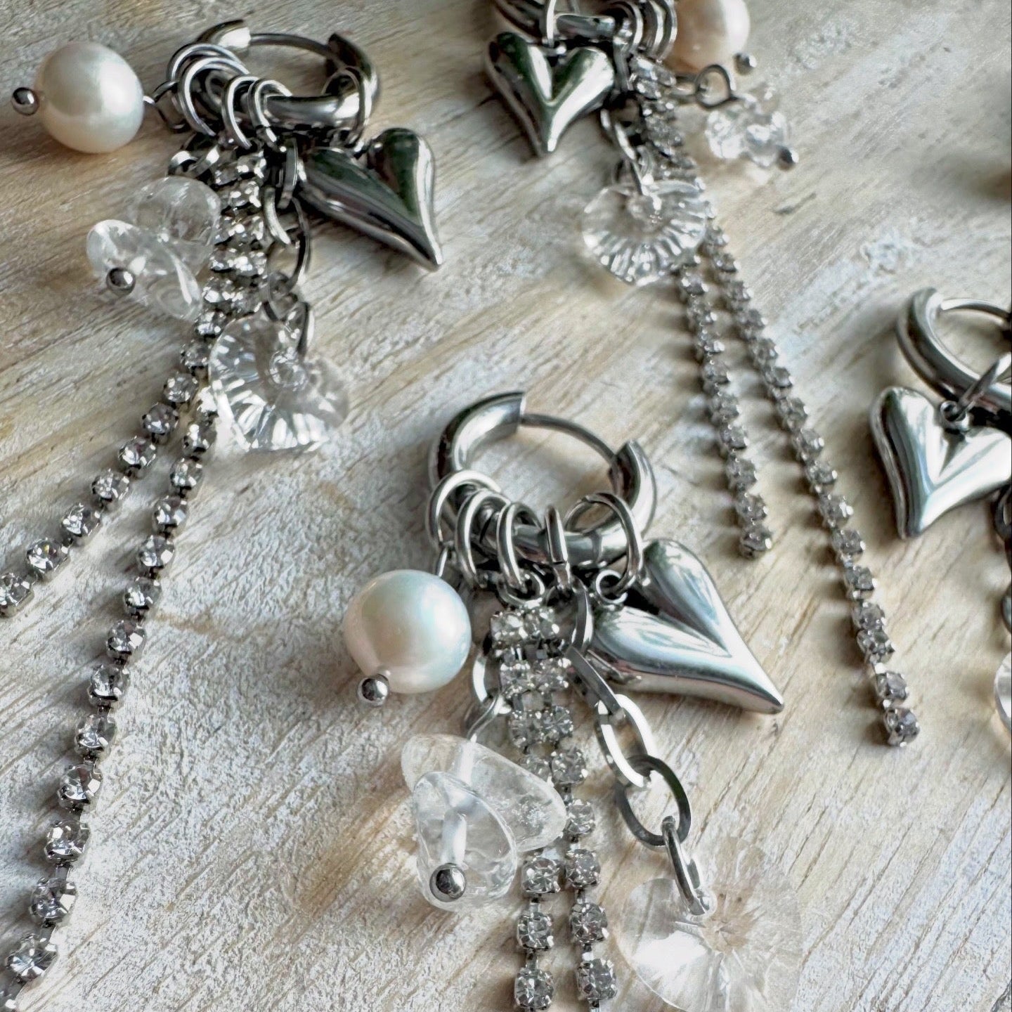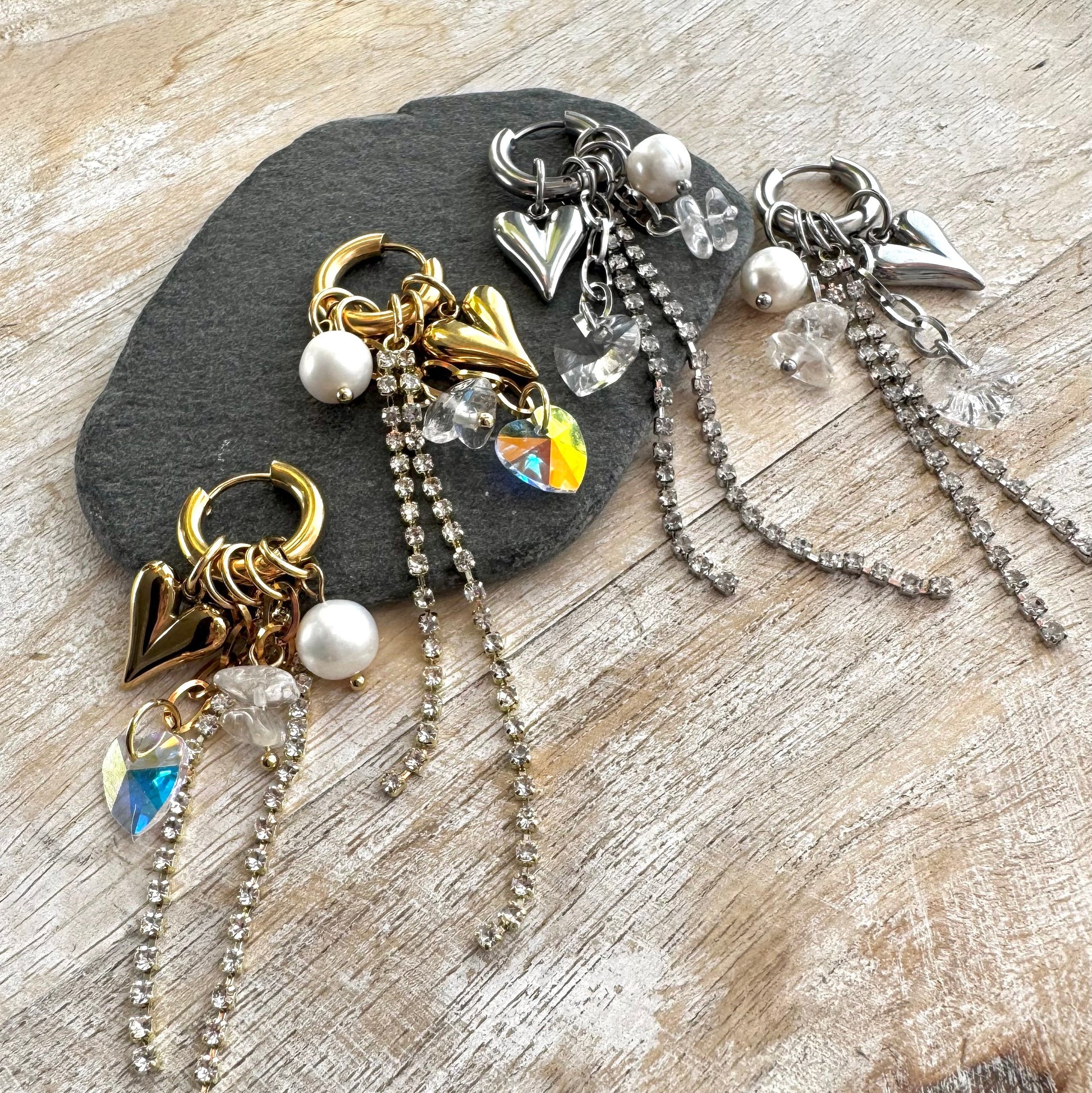Tässä ihanassa korvakorumallissa kauniit makeanvedenhelmet, vuorikristallia ja 2 erilaista sydänriipusta. Yhteensä siis 5 irrotettavaa riipusta.