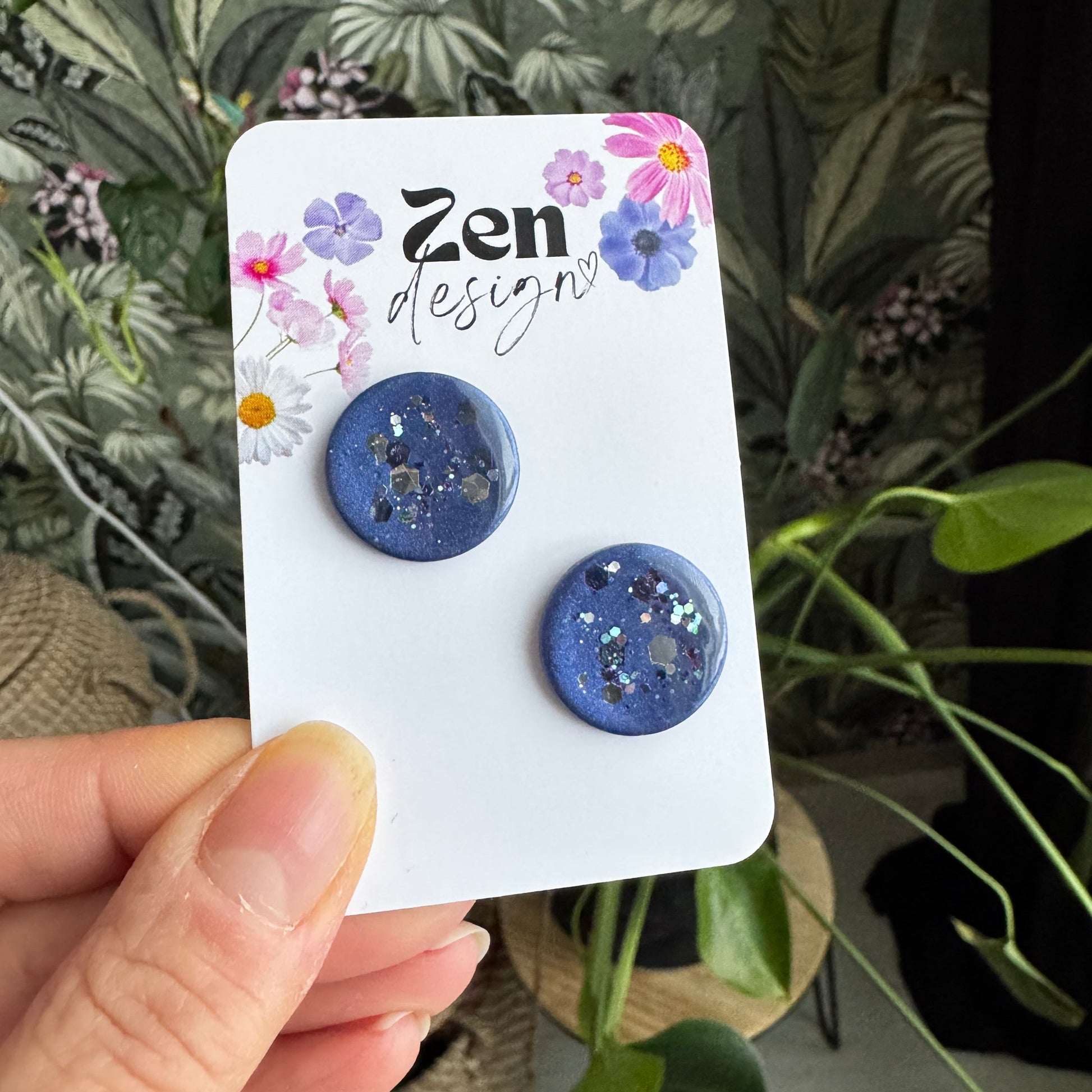 Siniset nappikorvakorut turkoosilla ja hopeisella glitterillä! Tappi on lähempänä reunaa, joten korvakoru mahtuu hyvin korvanlehdelle.