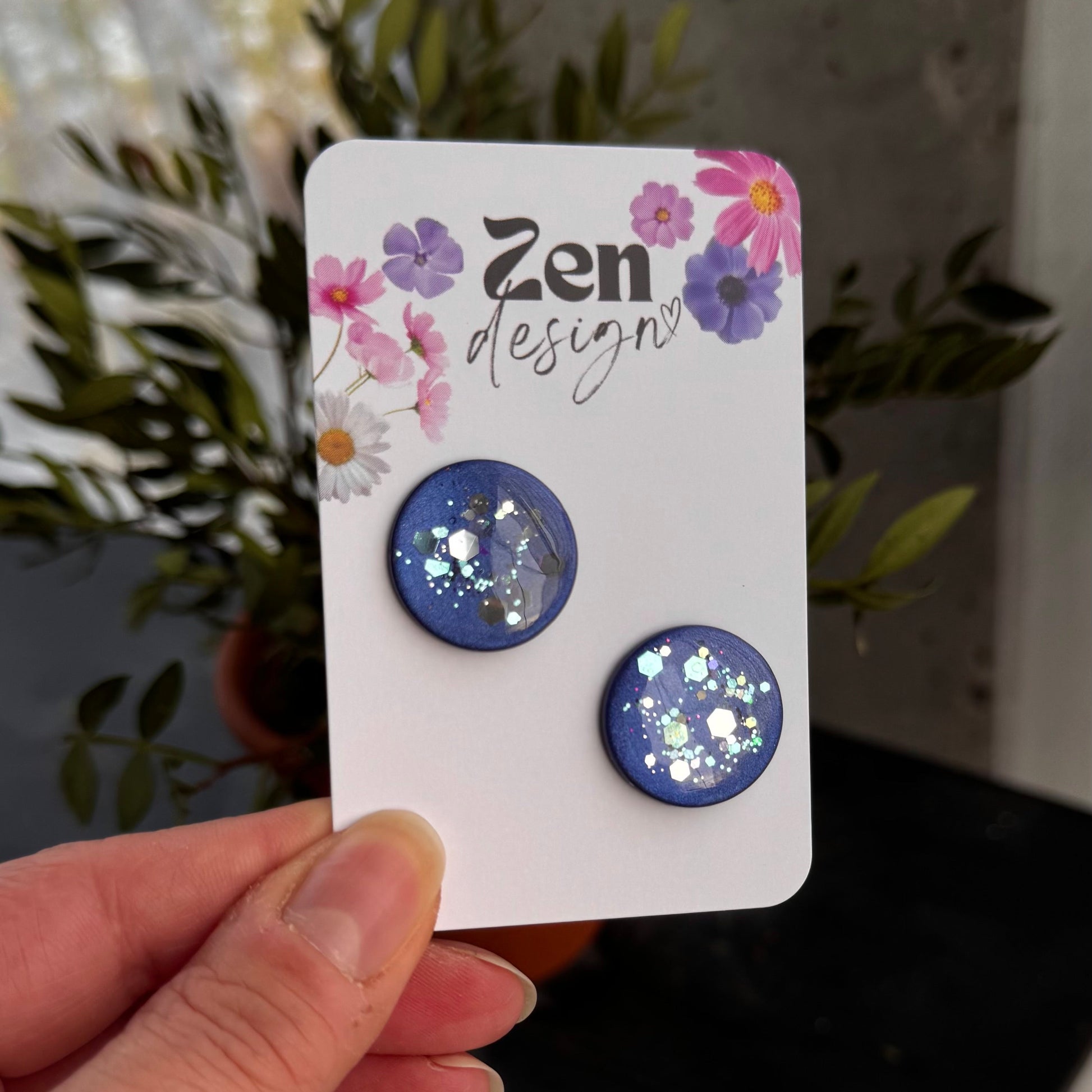 Sinisävyiset glitterkorvakorut! Tappi on lähempänä reunaa, joten korvakoru mahtuu hyvin korvanlehdelle.
