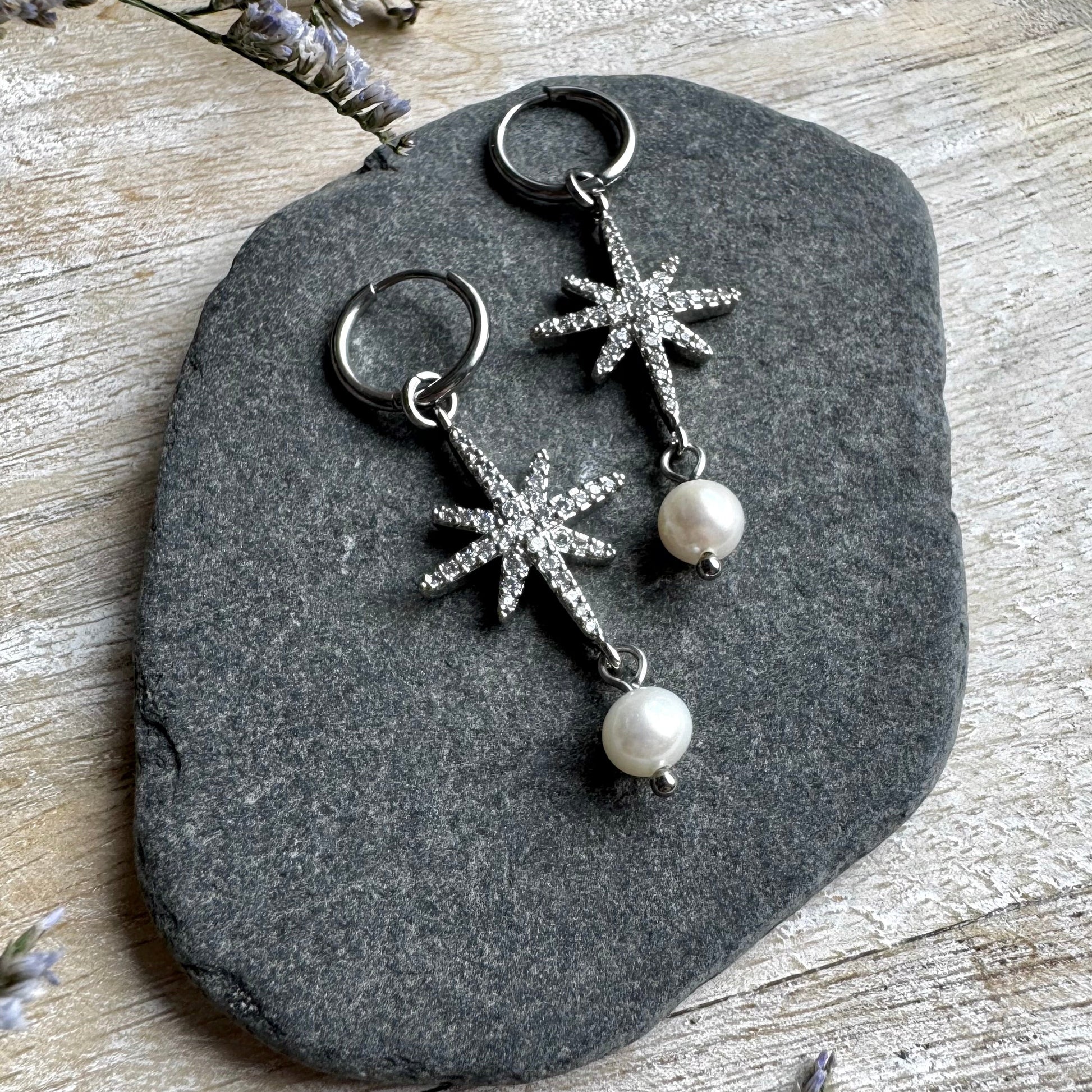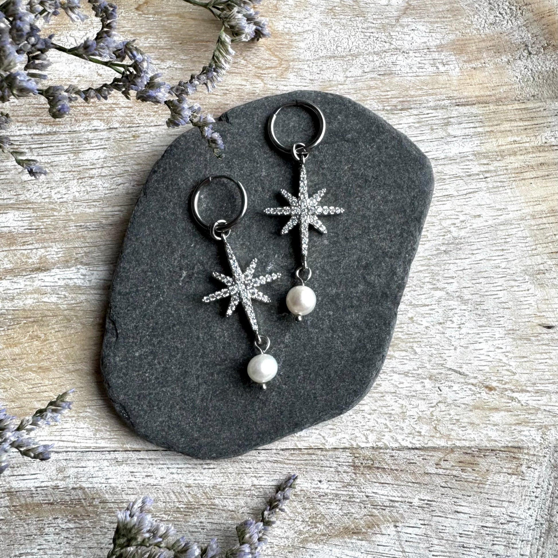 Korvakoruissa on strassein koristeltu tähti ja makeanvedenhelmi..