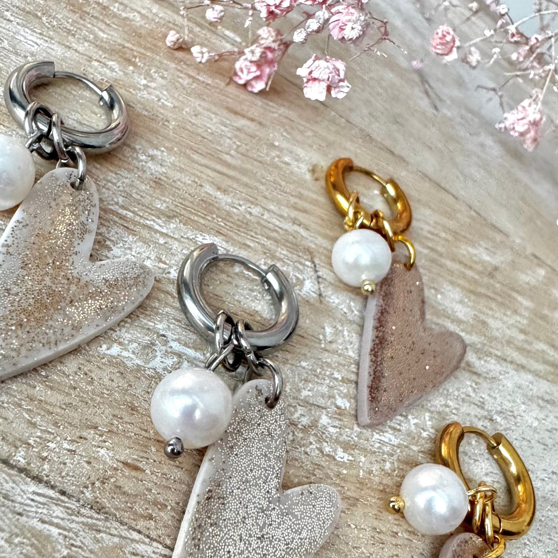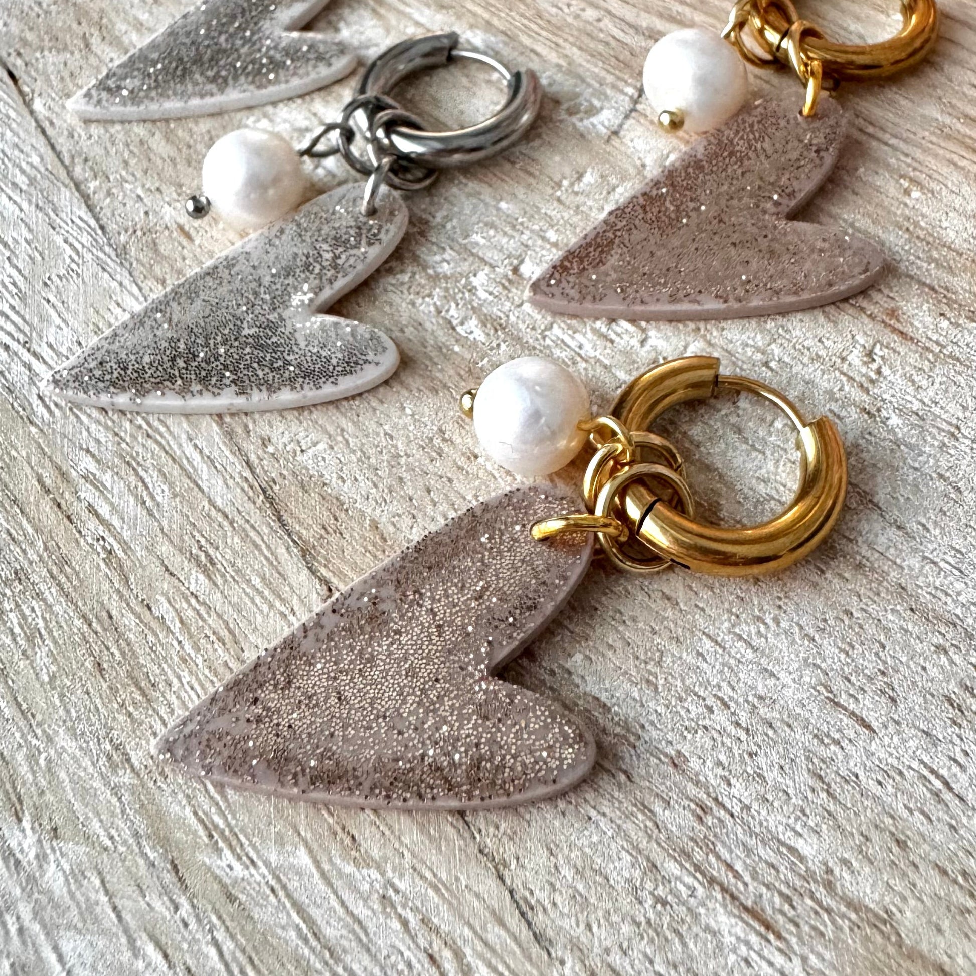 Sydänkorvakorut sulle, ystävälle vai molemmille? Sydämet säihkyvää kultaa tai hopeaa. Mukana iso makeanvedenhelmi. Riipukset on irroitettavat ja voit pitää myös pelkkiä renkaita. Sydämet on "samanpuoleiset", ei peilikuvat.