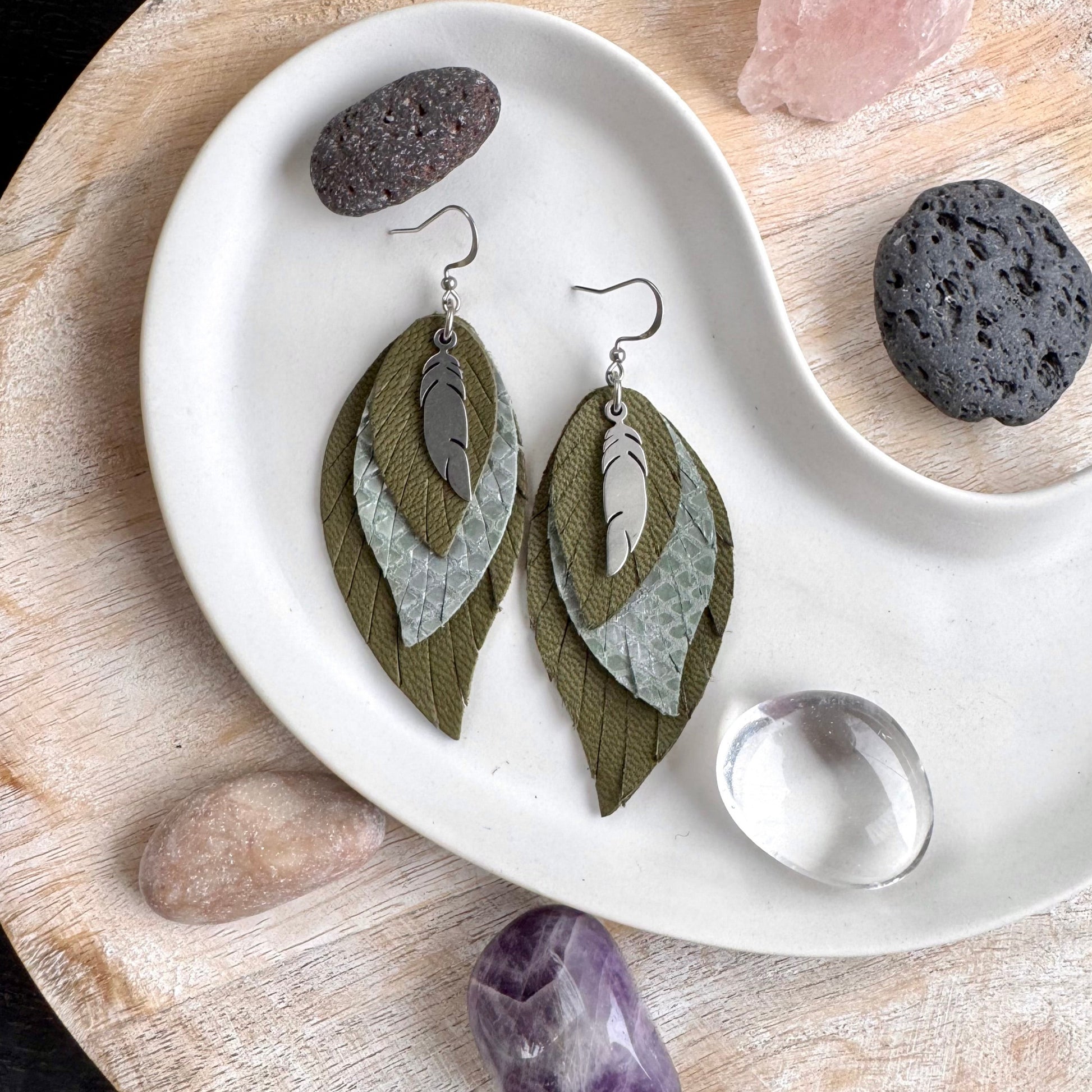 Keveät sulkakorvakorut kahdesta vihreän eri sävyisestä kierrätysnahasta! Korut on valmistettu Italialaisen vaate- ja asustevalmistaja ylijäämäpaloista. Tulossa myöhemmin myös Suomalaista nahkaa.