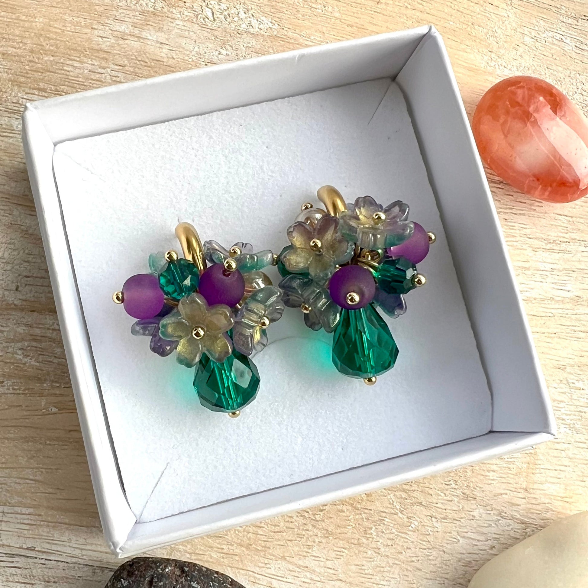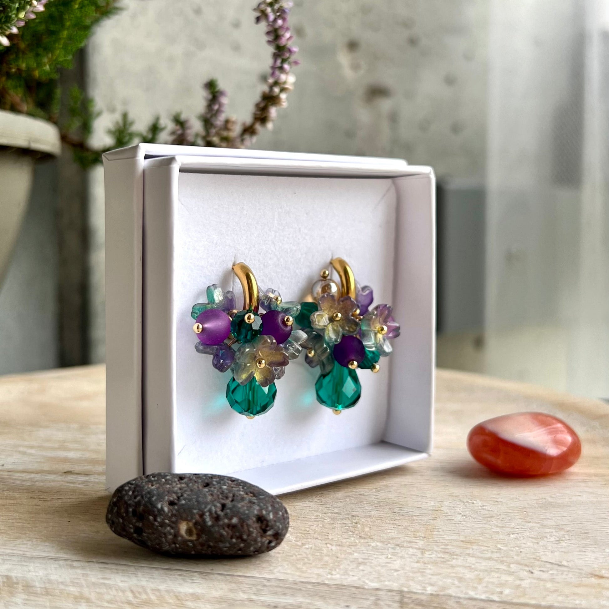 Suositut kukkakorvakorut! Tässä versiossa värityksenä violettia sekä vihreän eri sävyjä.