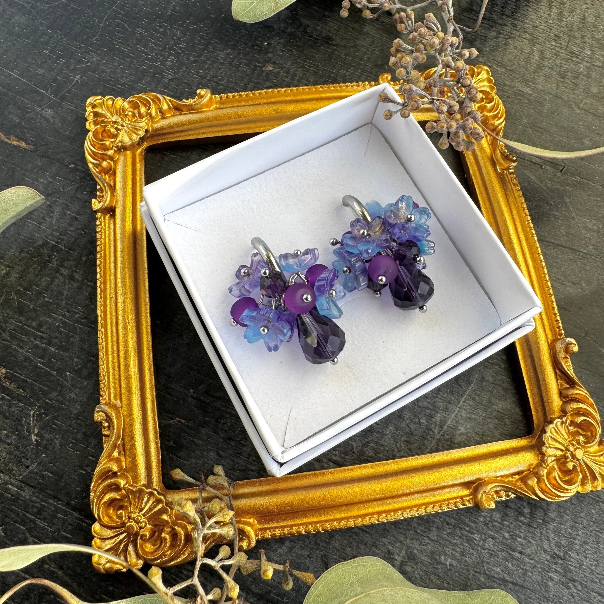 Suositut kukkakorvakorut! Väreinä violettia ja sinistä.