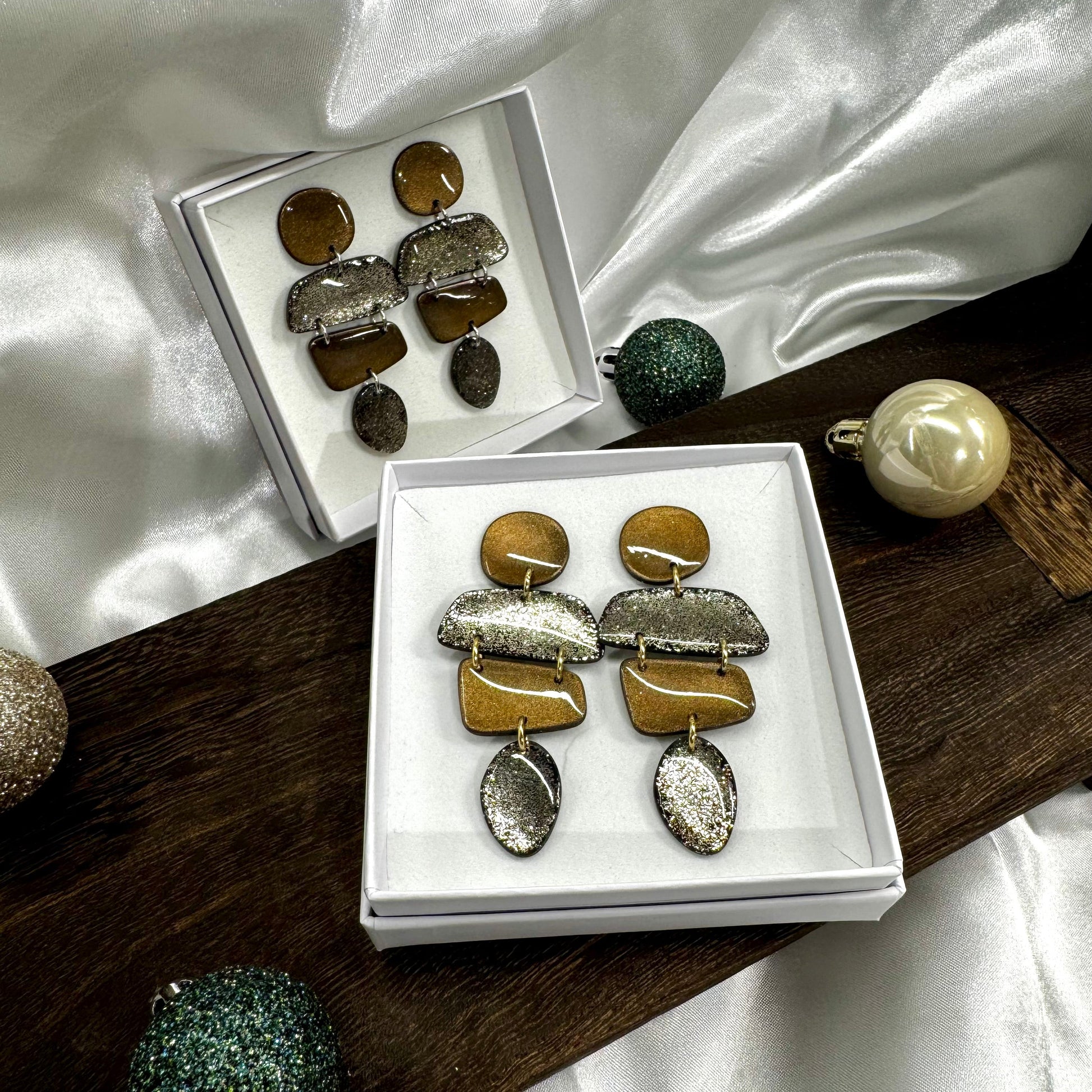Polku -sarja koostuu epäsäännöllisen muotoisista paloista, joita on vaihteleva määrä kussakin korvakorussa. Tässä mallissa on himmeästi kimaltavaa ruskeaa, sekä kulta- tai hopeaglitteriä valintasi mukaan.