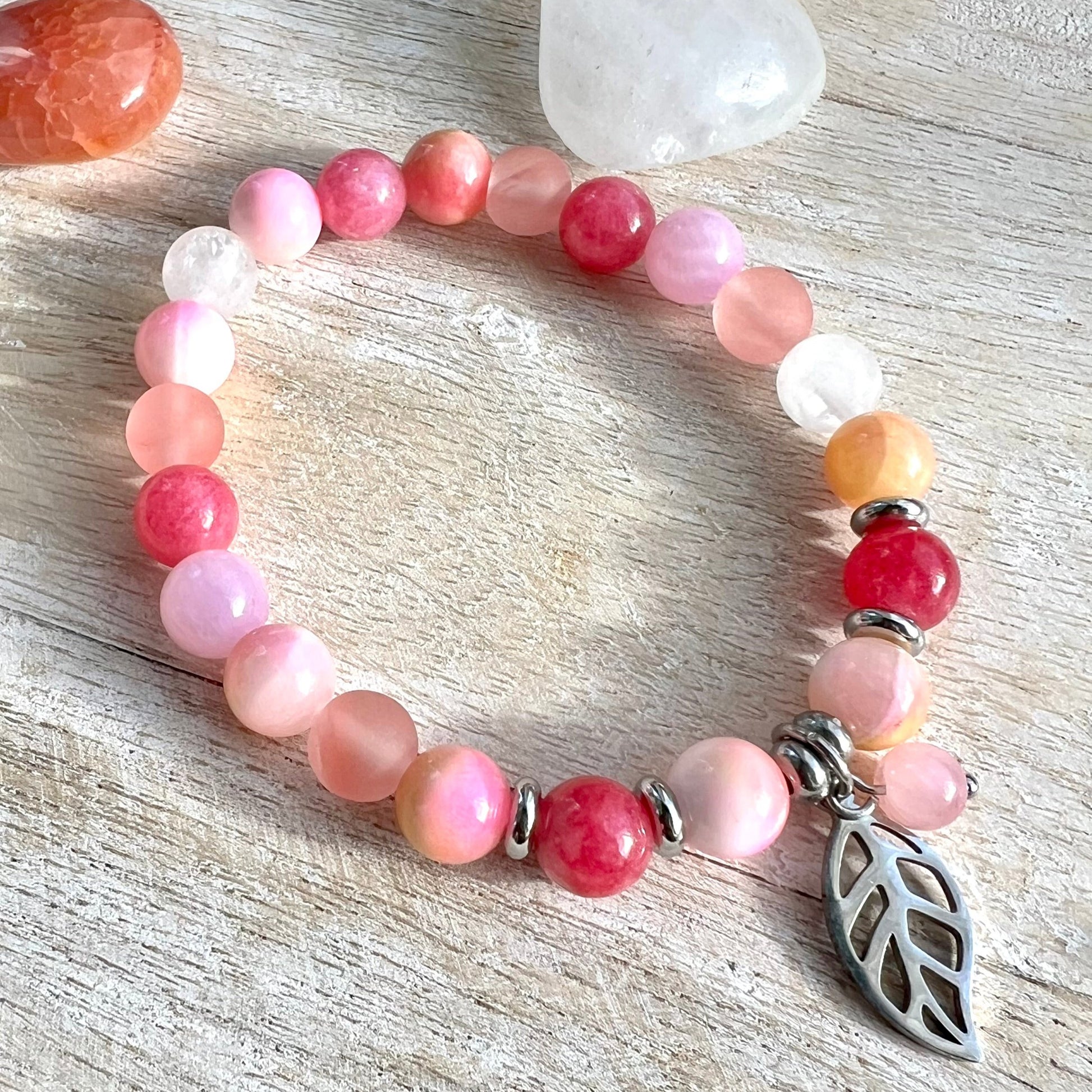 Pinkki rannekoru, josta löytyy lilaa kunziittia, pinkkiä rodokrosiittia, mattapintaista kirsikkakvartsia ja valkoista & värjättyä jadea! Helmet ovat halkaisijaltaan n. 8 mm ja metalliosat ovat kirurginterästä.