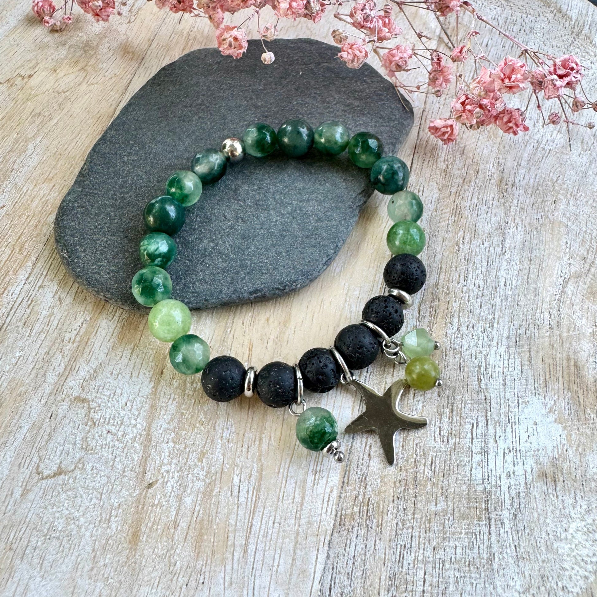 Rannekoru, jossa mustaa laavakiveä, vihreää turmaliinia ja kalsedonia! Helmet ovat halkaisijaltaan n. 8 mm ja metalliosat ovat kirurginterästä.