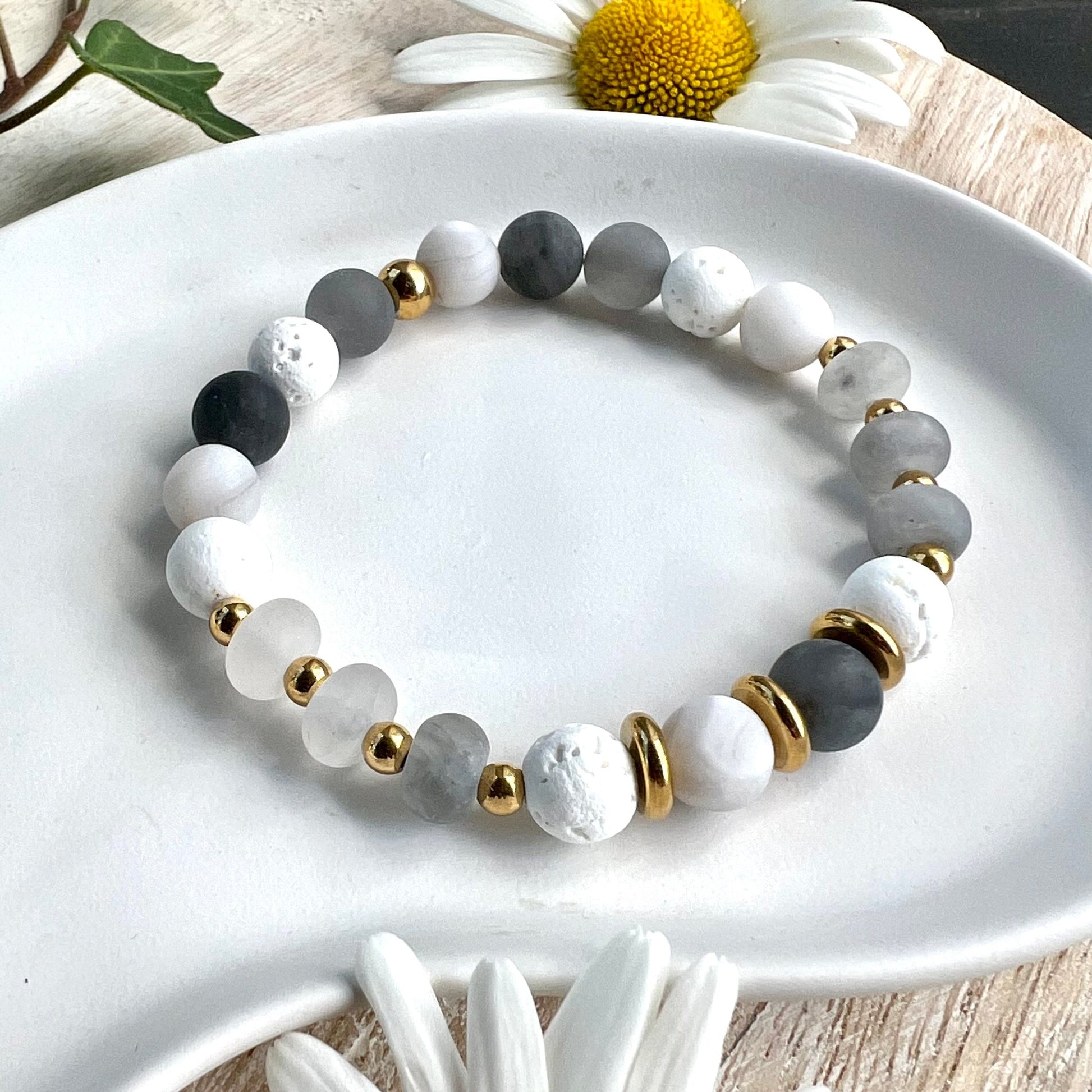 Rannekoru jossa mm. valkoisia laavakiviä, sekä harmaata kvartsia! Helmet ovat halkaisijaltaan n. 8 mm. Metalliosat ovat kullattua kirurginterästä.