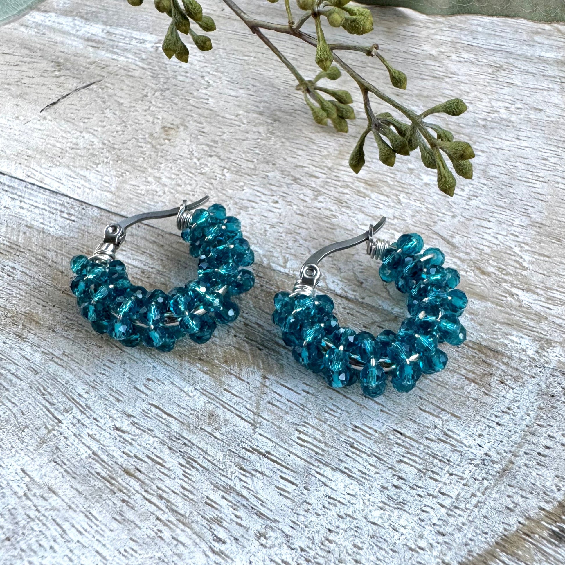 Pienistä tumman turkooseista lasihelmistä kootut korvarenkaat!