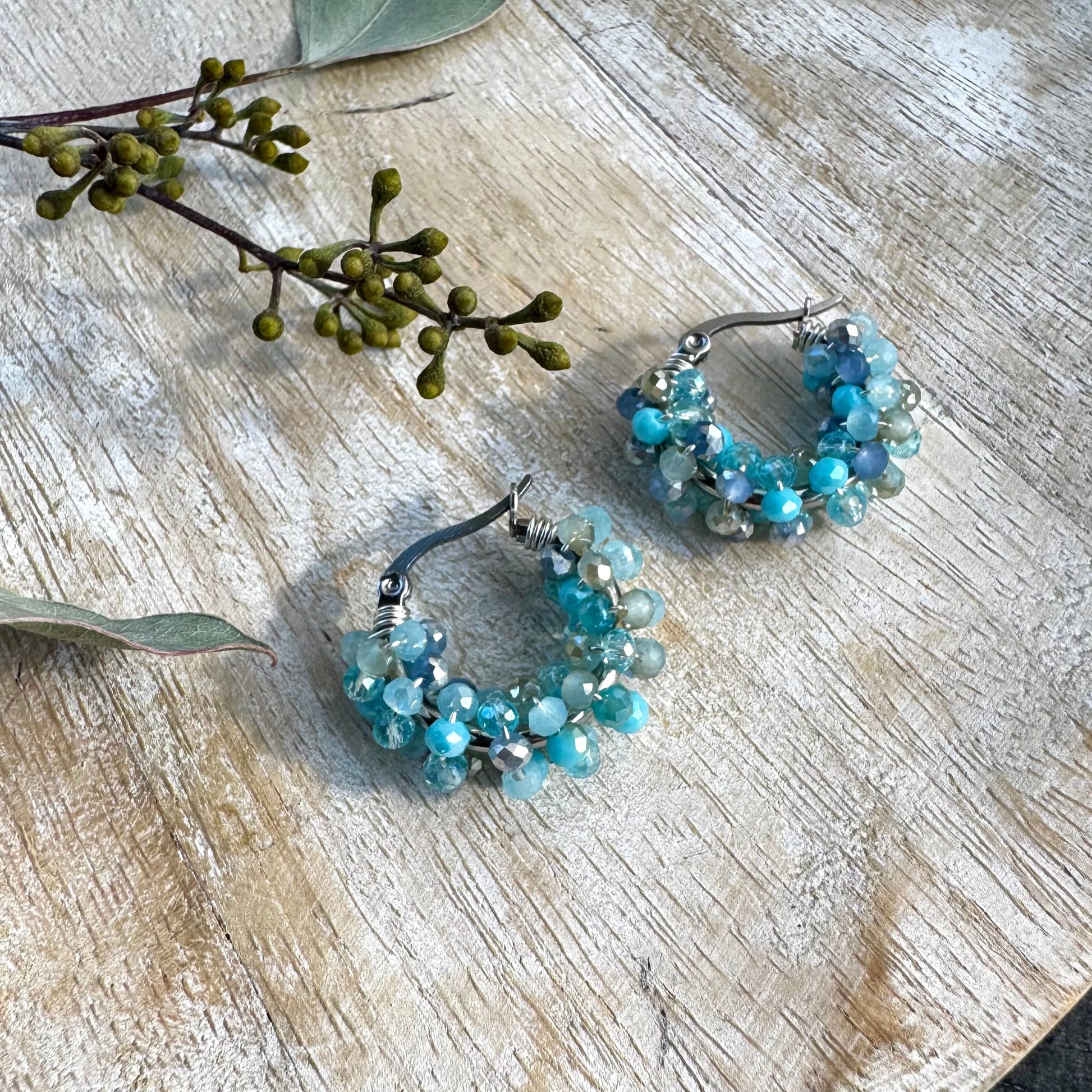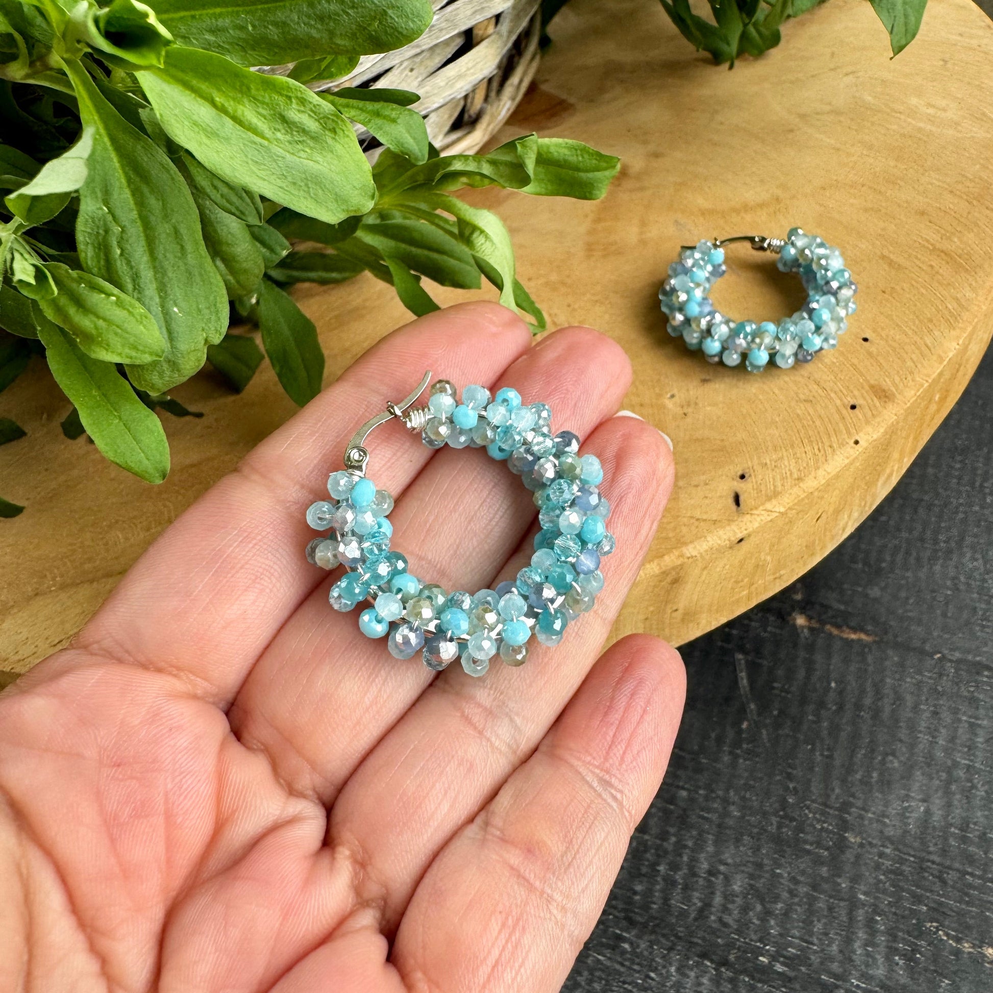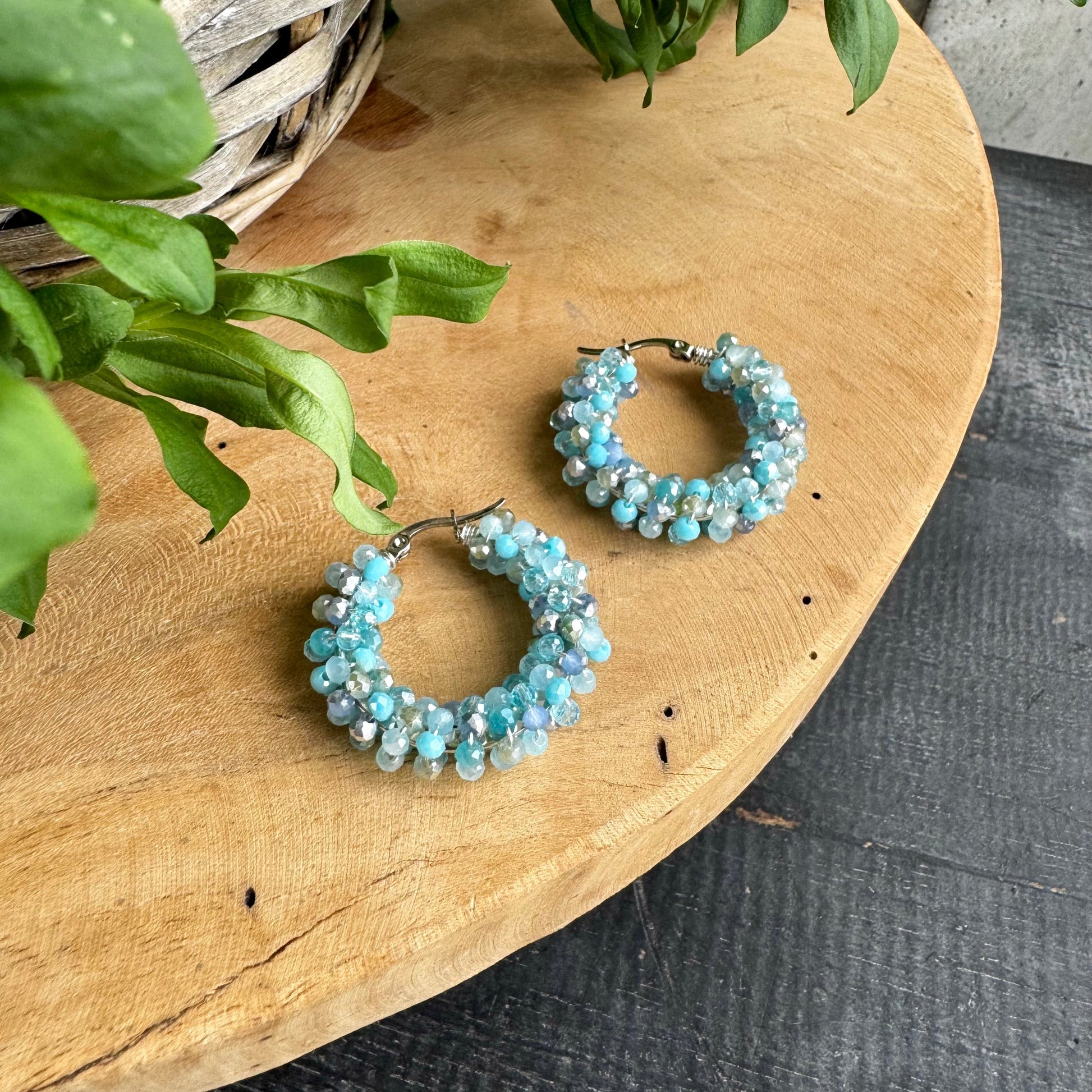 Pienistä vaalean turkooseista lasihelmistä kootut korvarenkaat!