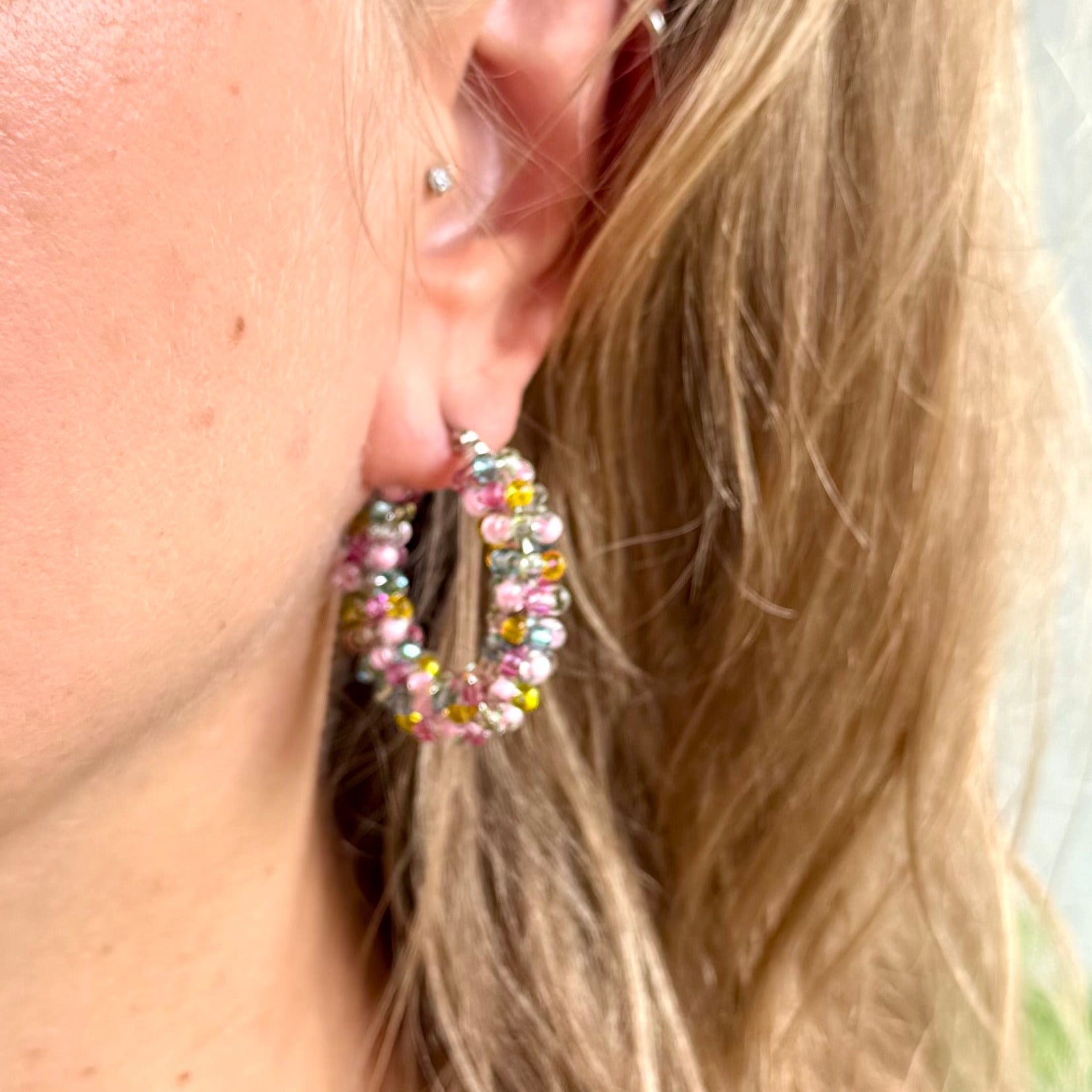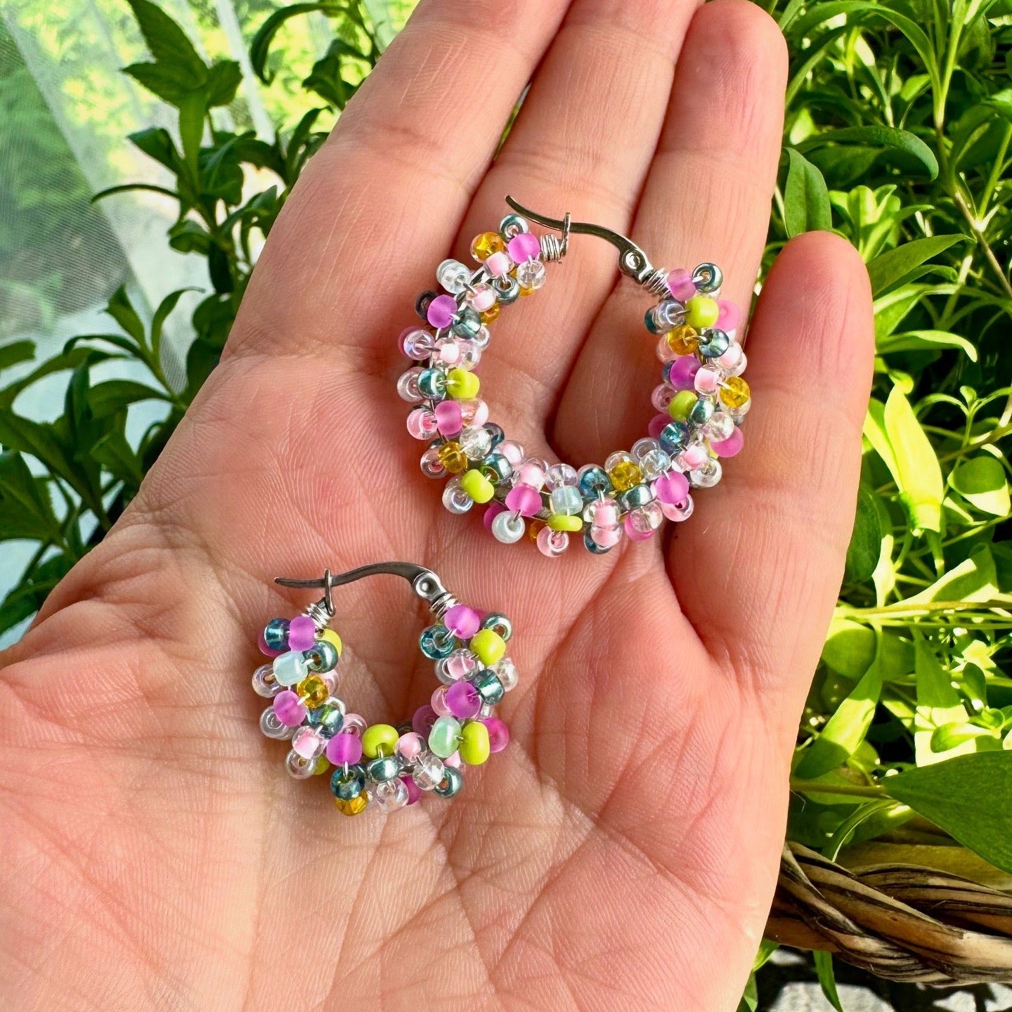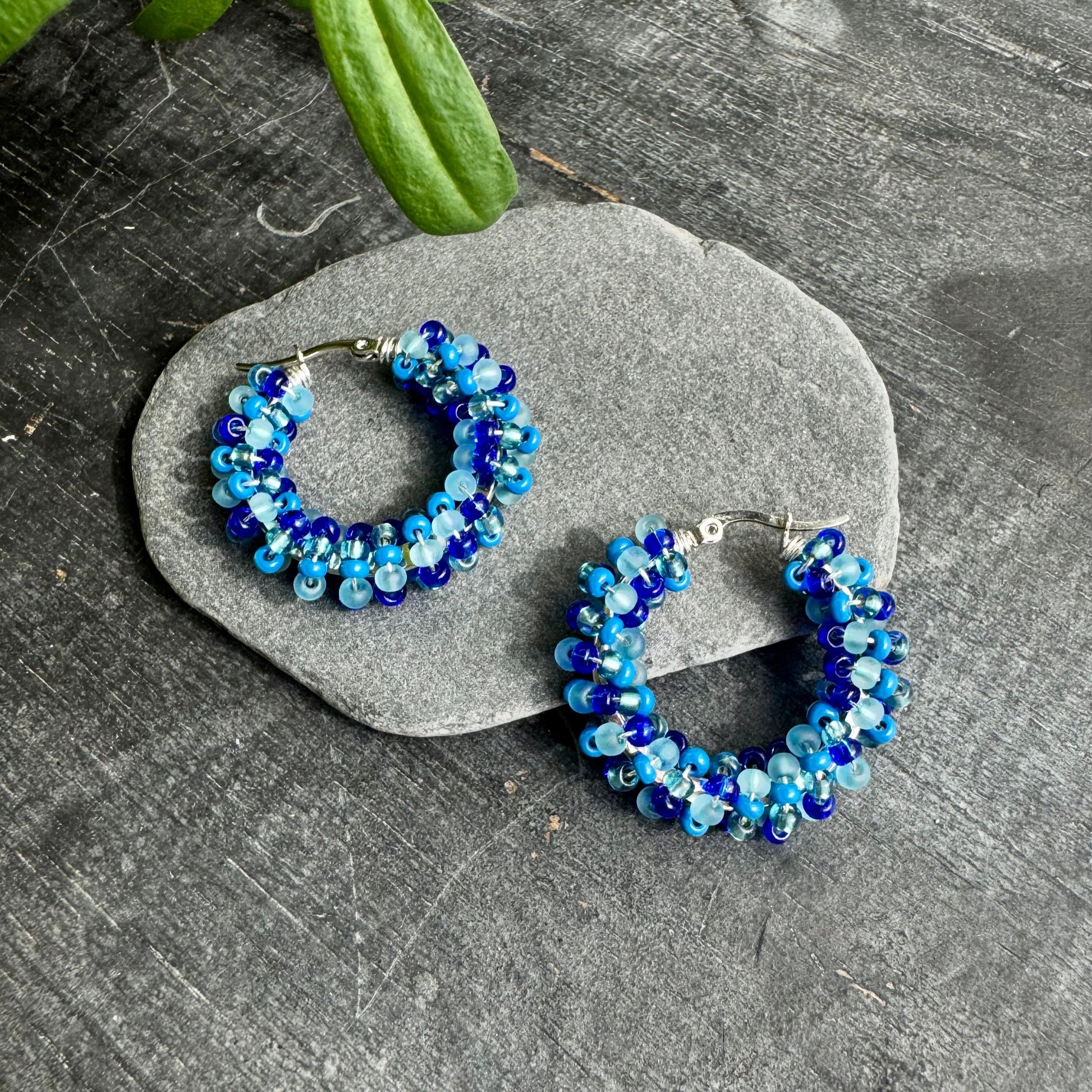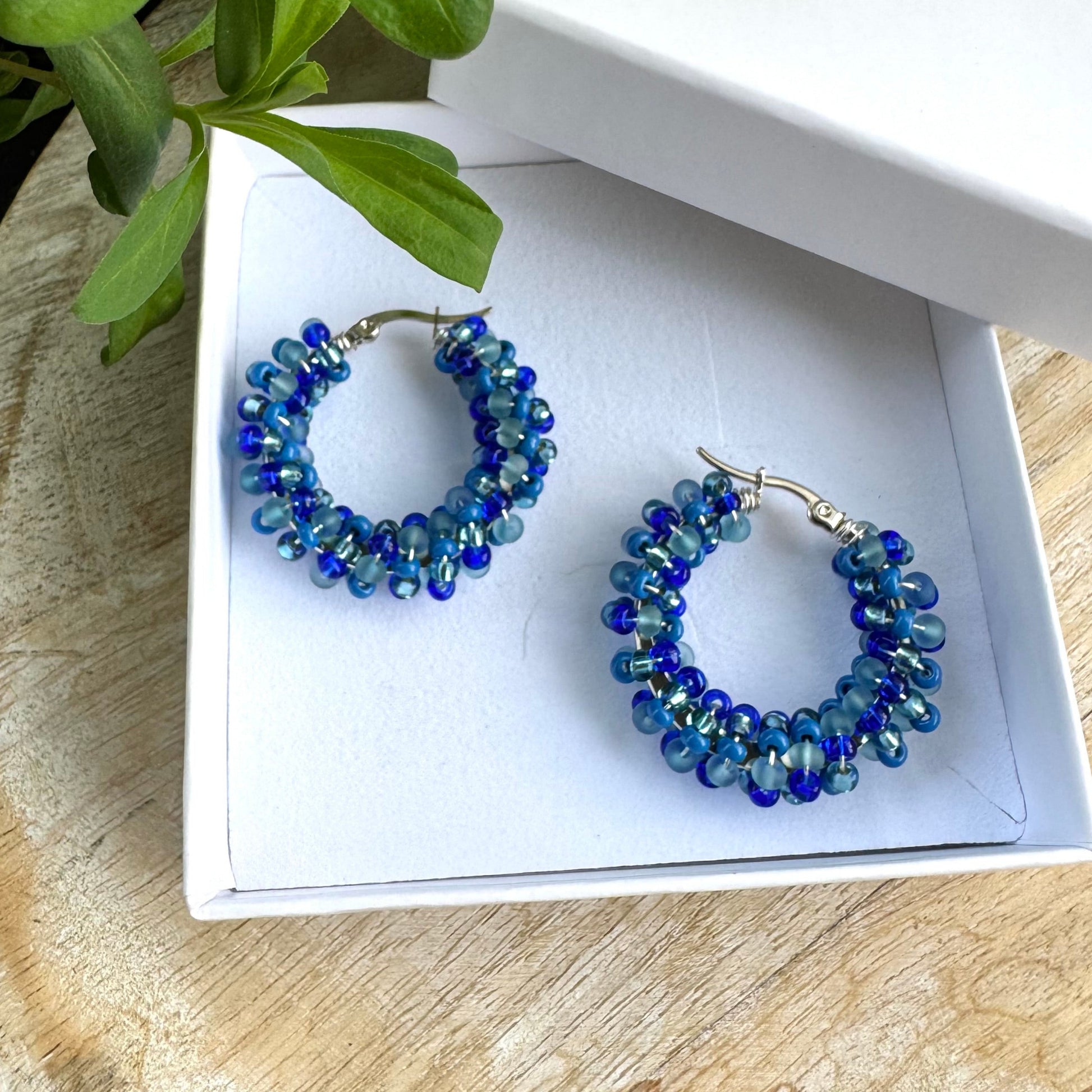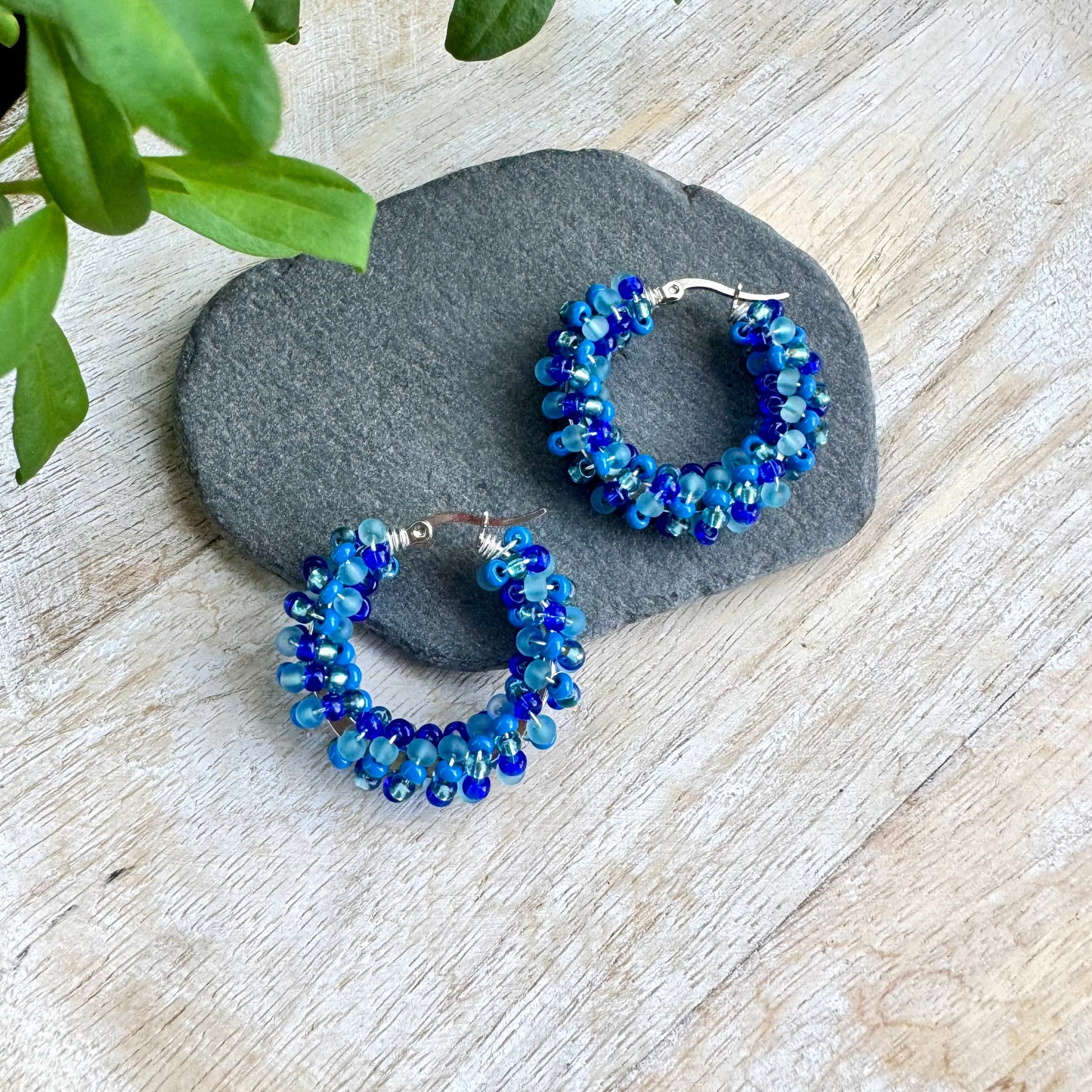 Pienistä sinisistä lasihelmistä kootut korvarenkaat!