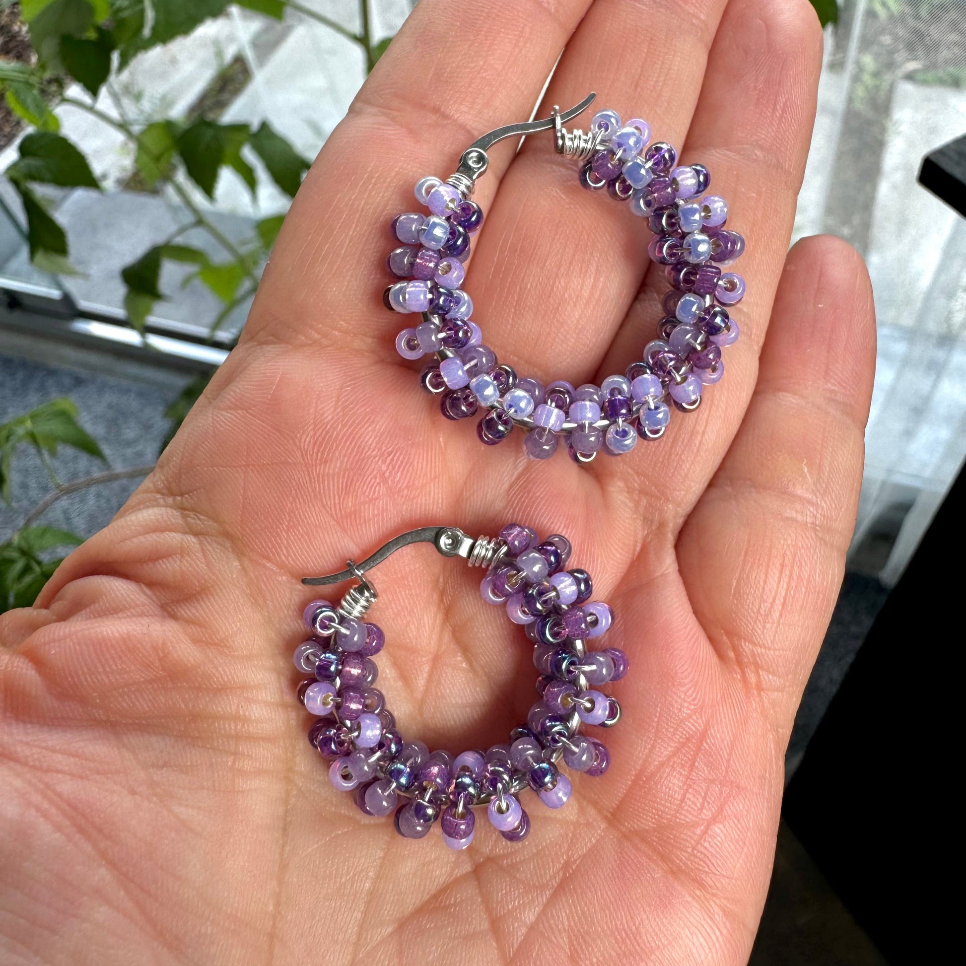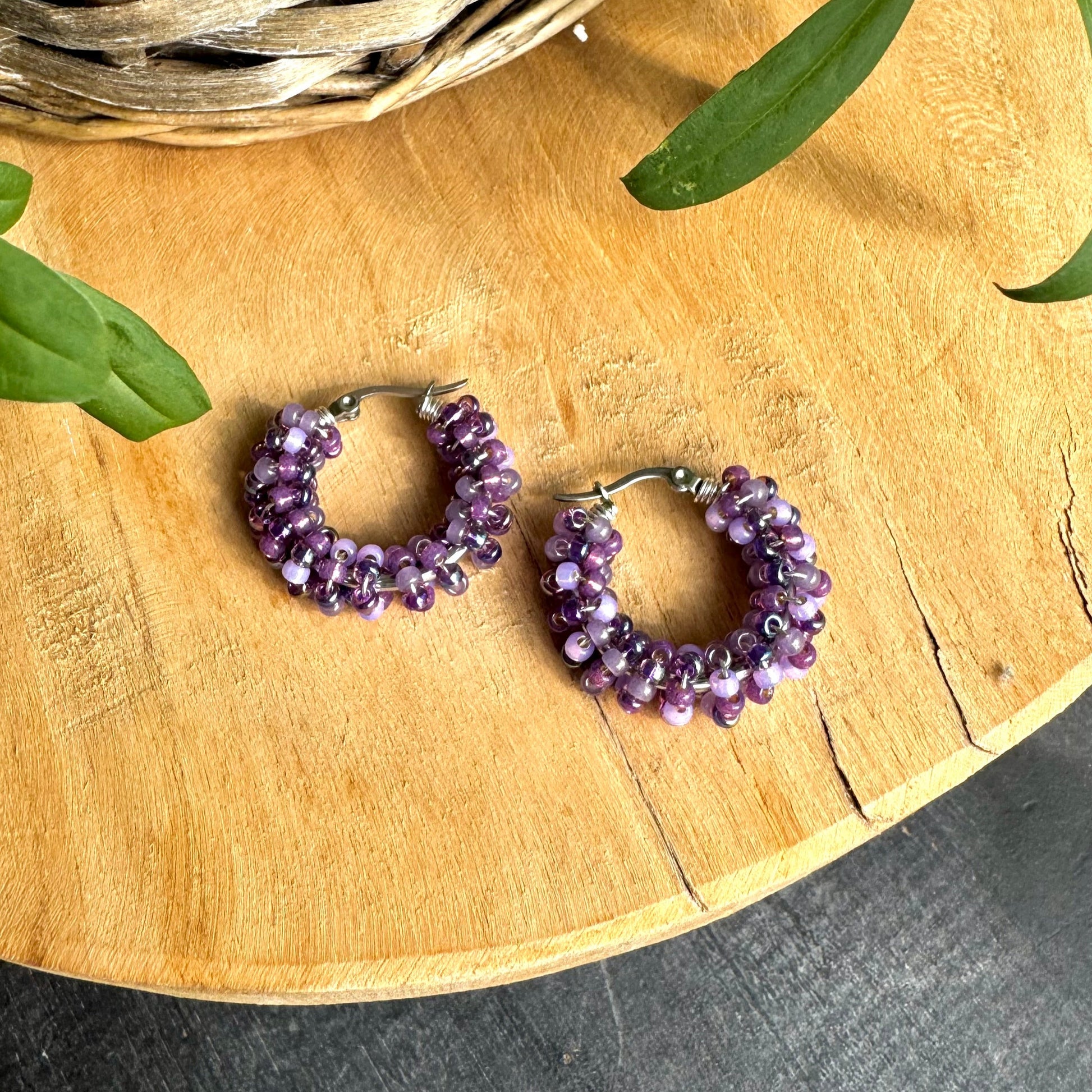 Pienistä lilan ja violetin värisistä lasihelmistä kootut korvarenkaat!