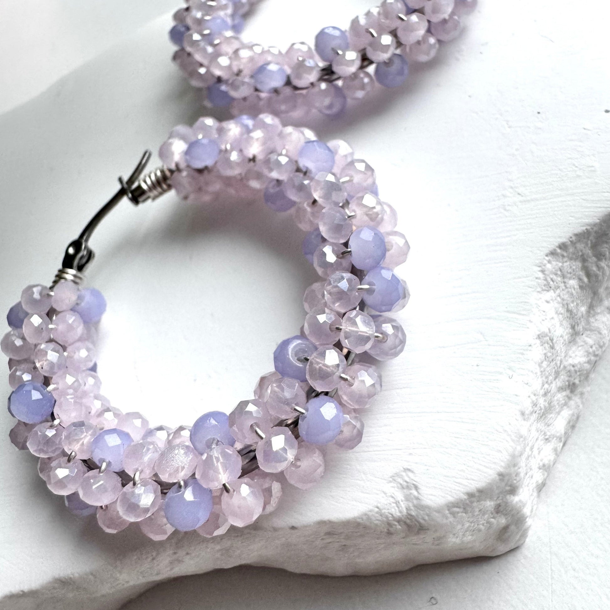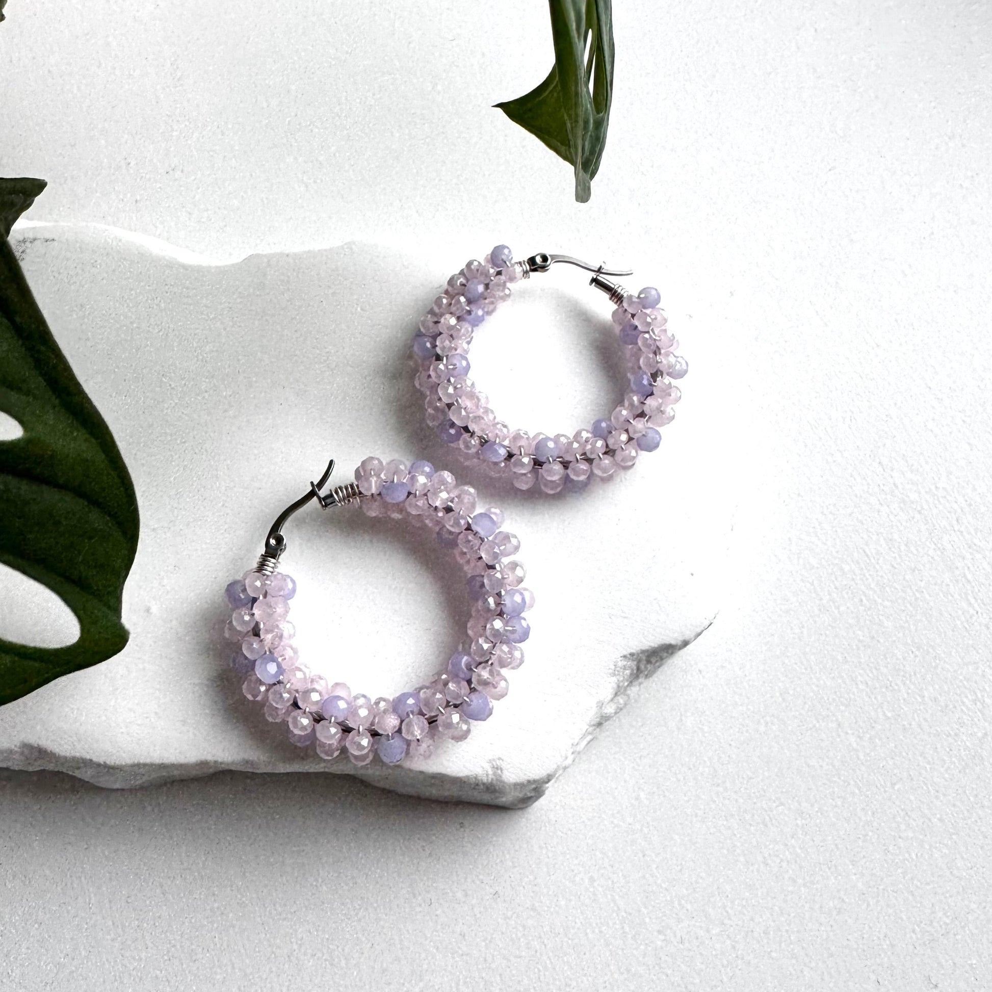 Vaaleanpunaisista ja liloista lasihelmistä kootut korvarenkaat!