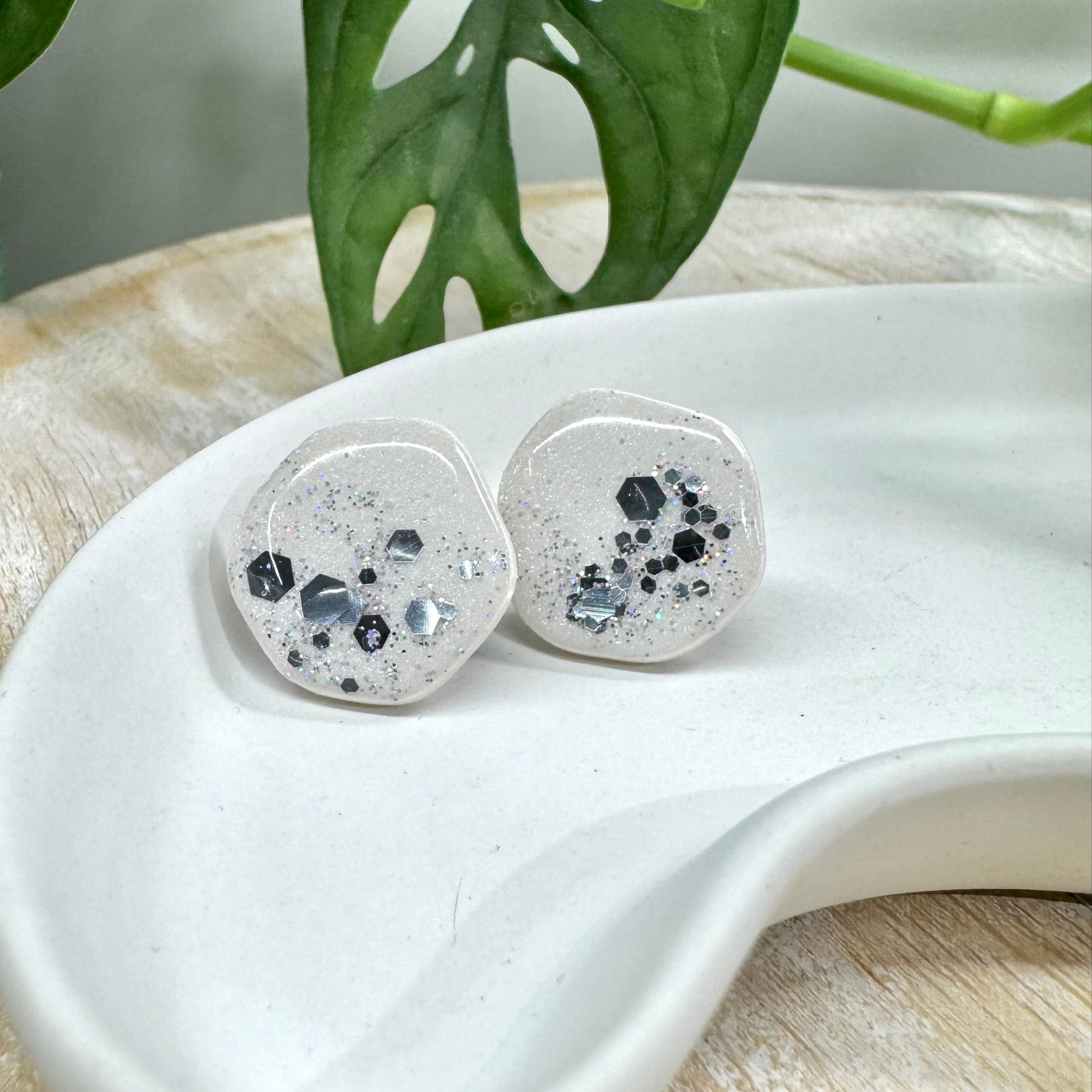 Stellar-nappien isompi versio. Valkoiset, glitterillä koristellut nappikorvakorut.