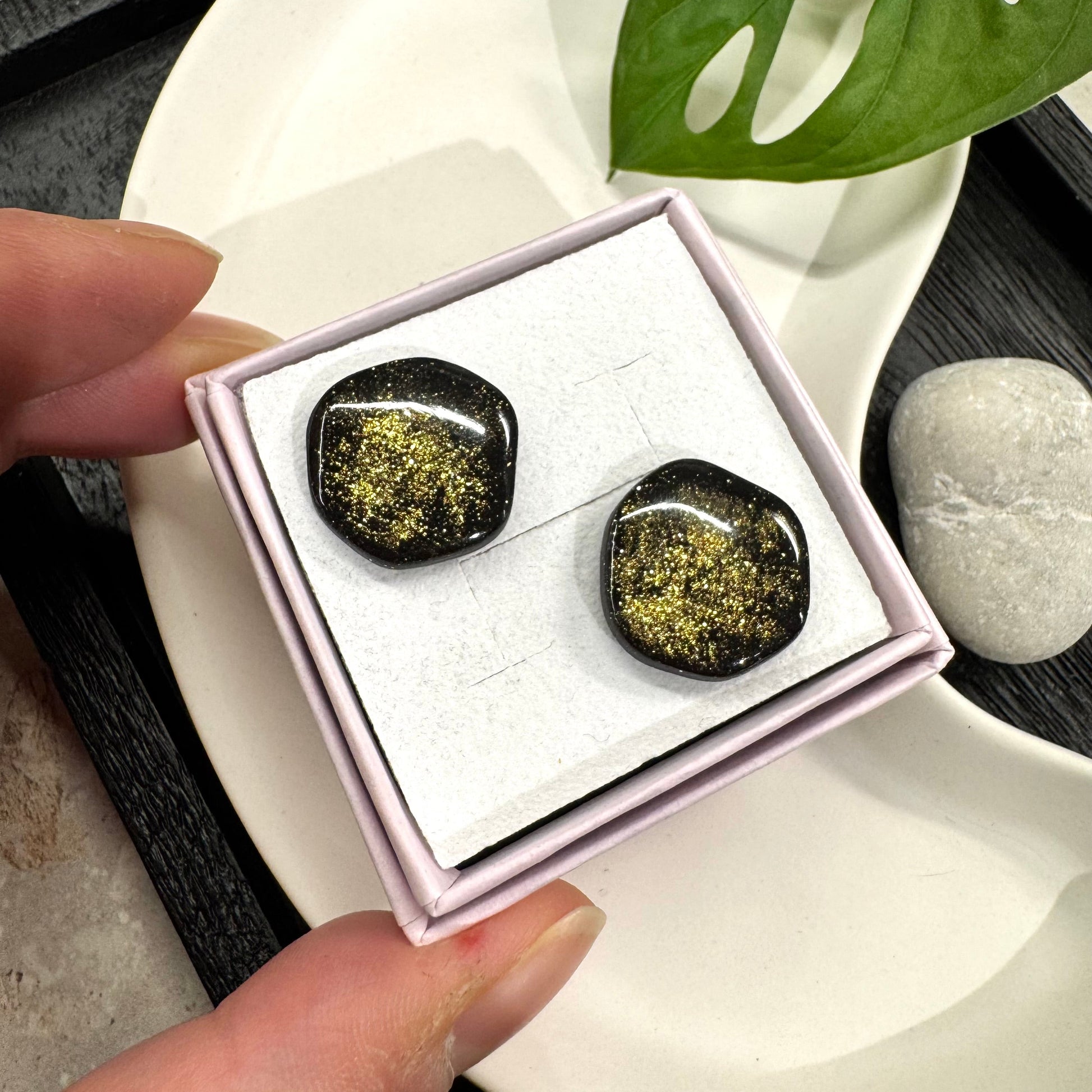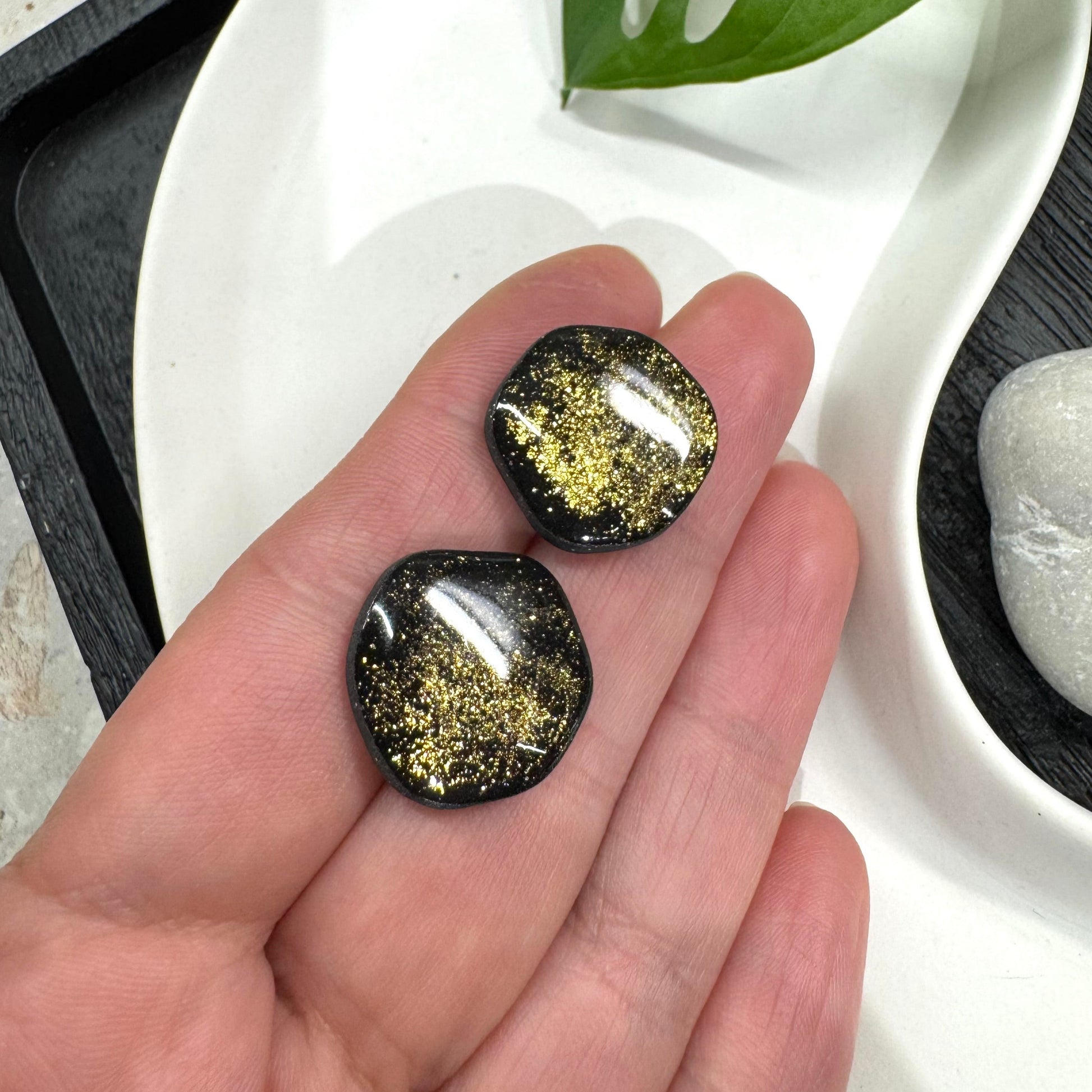 Stellar-nappien isompi versio. Mustat nappikorvakorut ripauksella kultaista hilettä.
