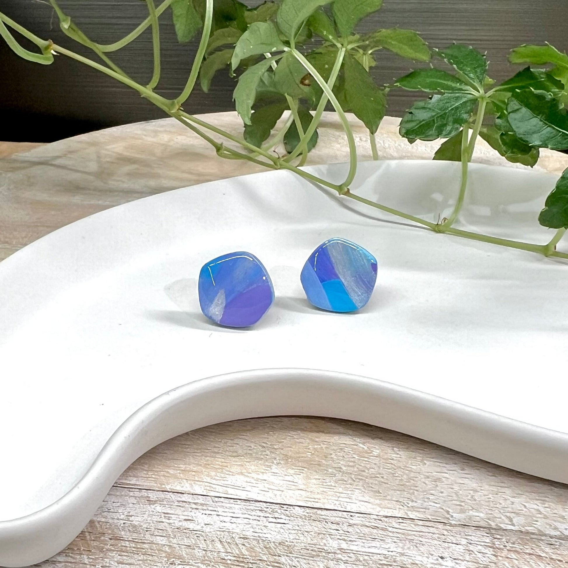 Stellar-nappien pienempi versio. Hopean, vaaleansinisen ja lilan sävyiset, kiiltävällä pinnoituksella koristellut epäsäännöllisen muotoiset nappikorvakorut! Korvakorun tappi on keskellä nappia. Korvakorujen kuviointi voi vaihdella hiukan, valmistustekniikasta johtuen.