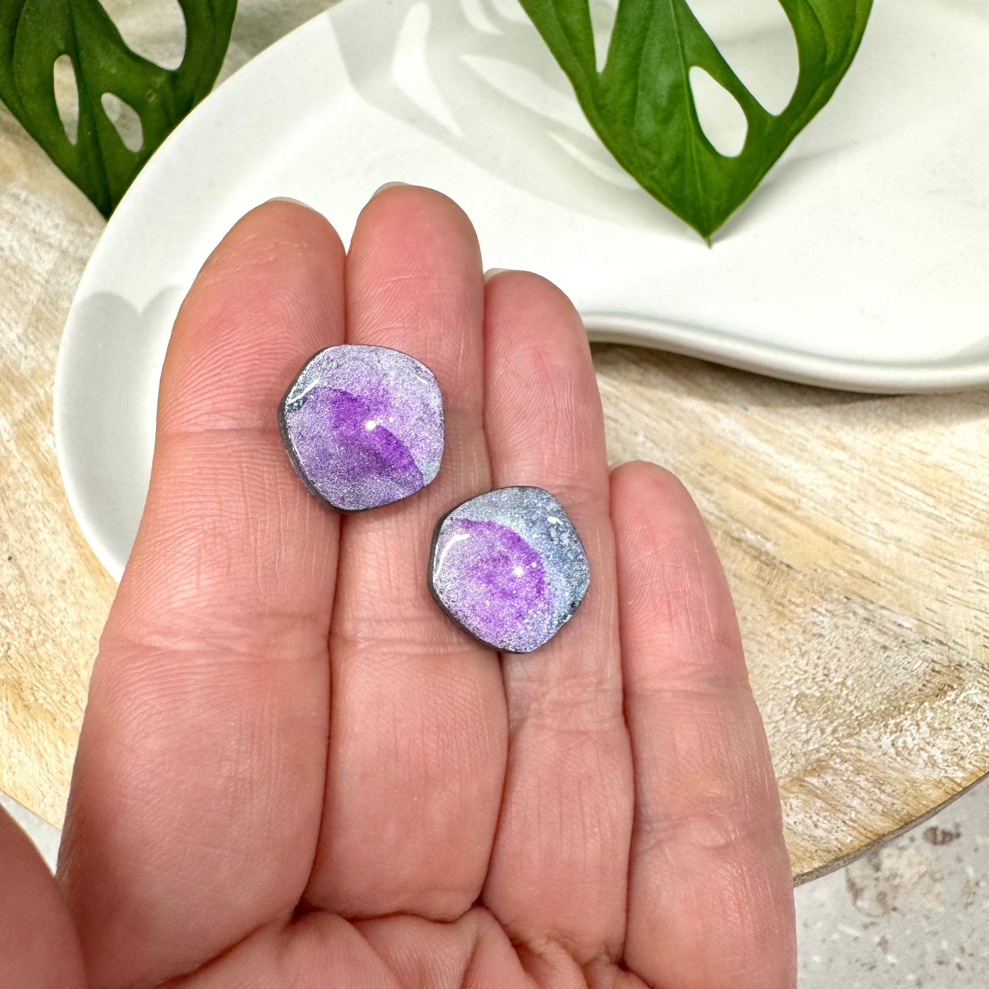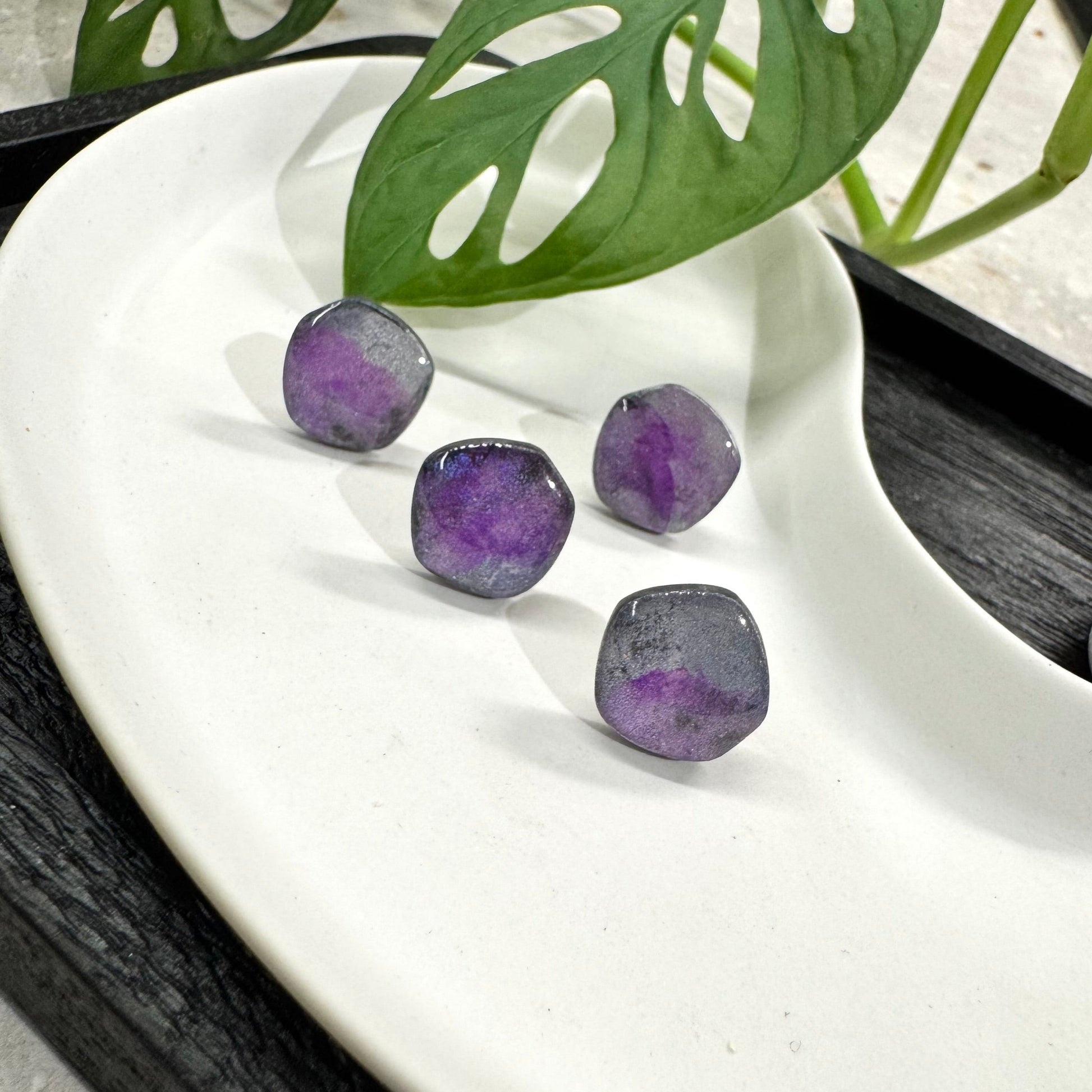 Stellar-nappien pienempi versio. Mustalla pohjalla hopeaa ja lilaa/violettia. Epäsäännöllisen muotoiset nappikorvakorut! Korvakorun tappi on keskellä nappia.