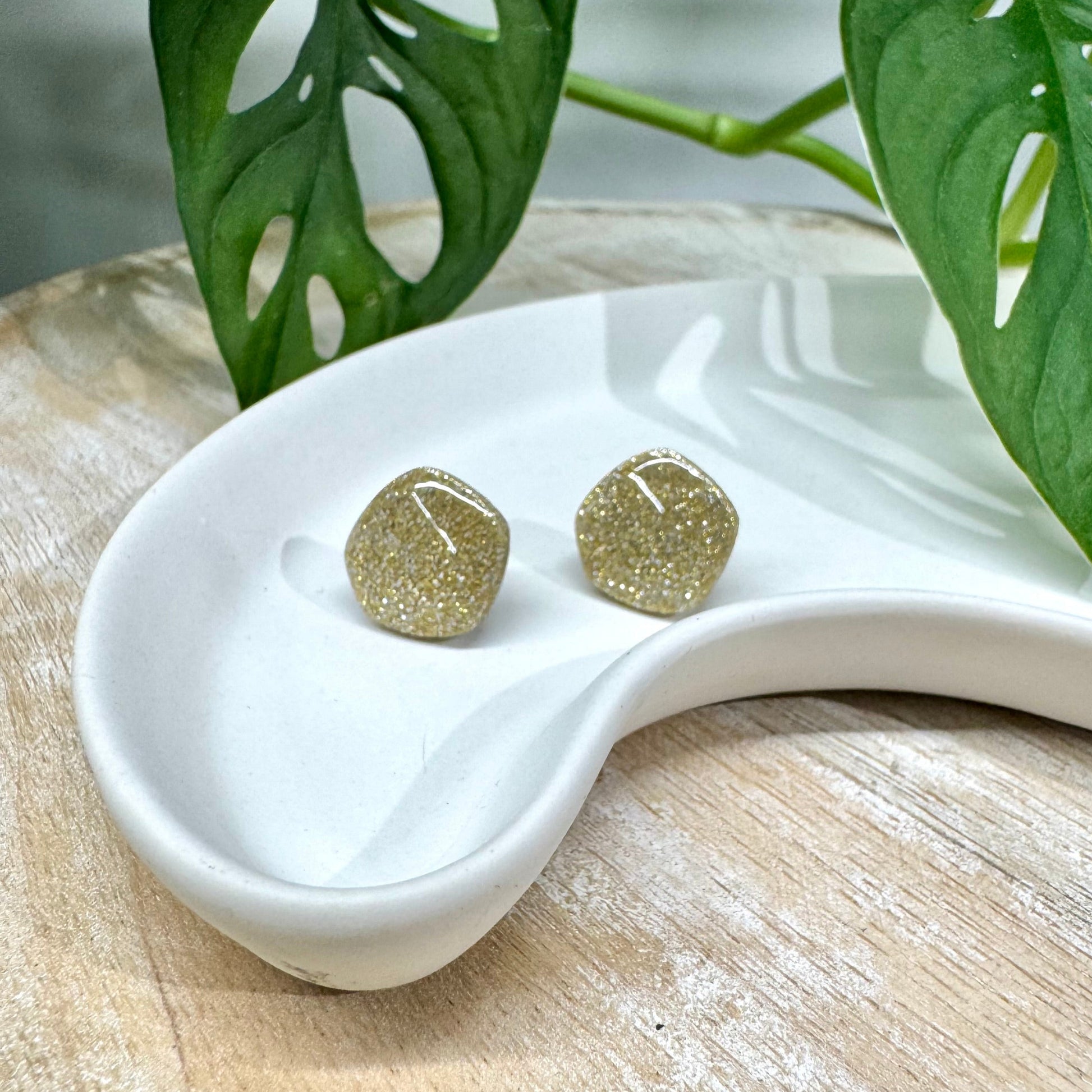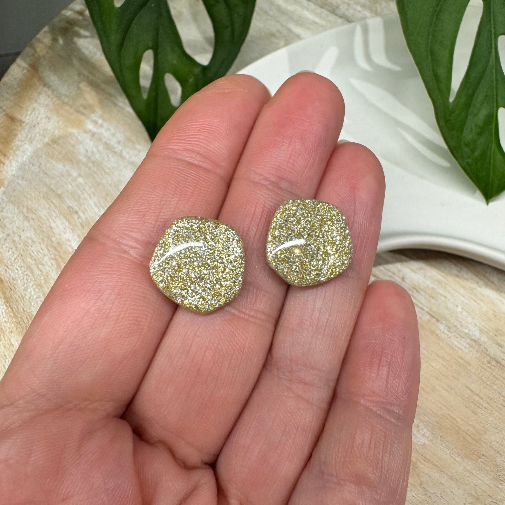 Stellar-nappien pienempi versio. Kullanväriset, päsäännöllisen muotoiset glitternappikorvakorut! Korvakorun tappi on keskellä nappia.